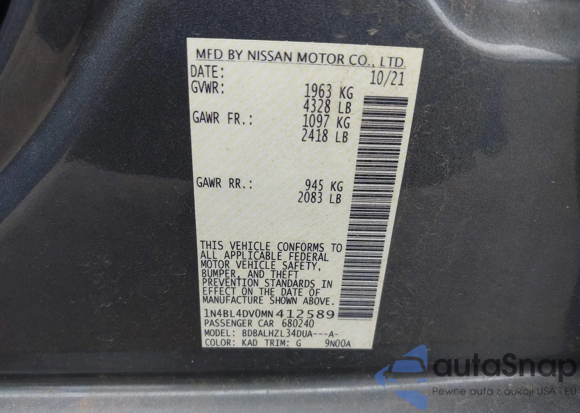LOT: 43051744 VIN: 1N4BL4DV0MN412589