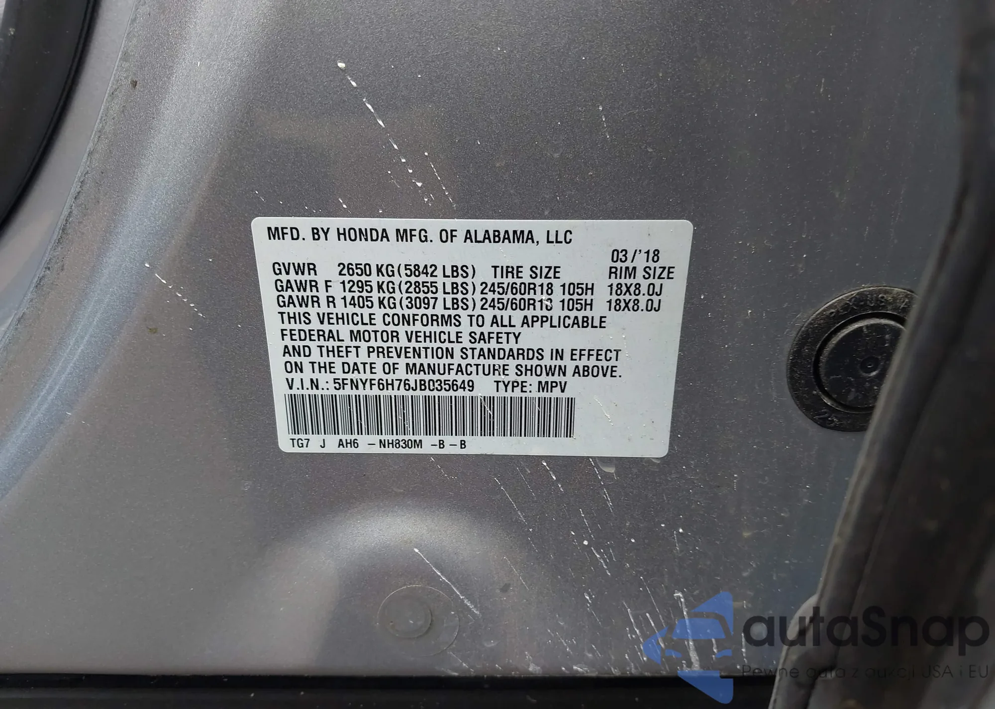 • VIN 5FNYF6H76JB035649