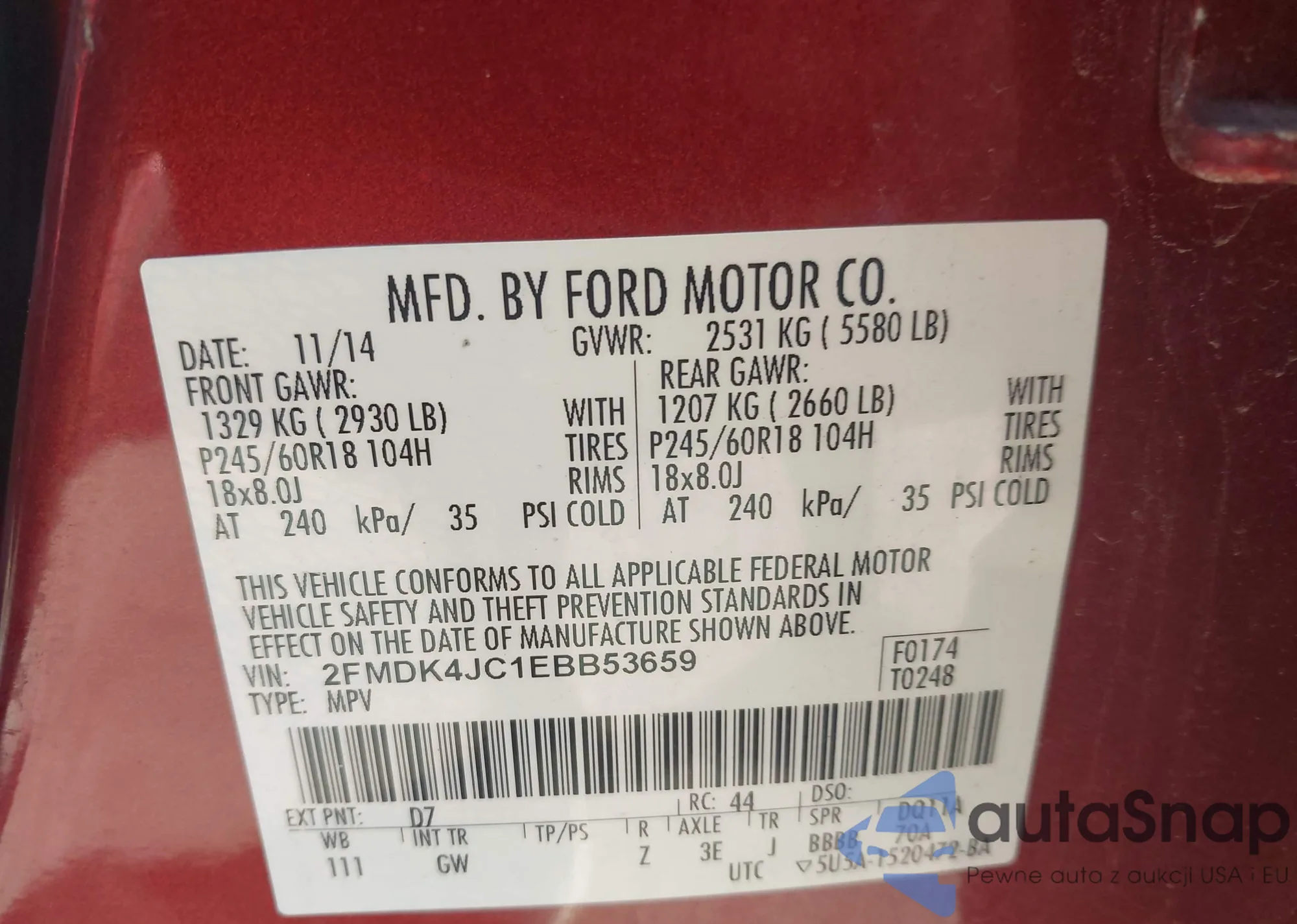 LOT: 43065470 VIN: 2FMDK4JC1EBB53659