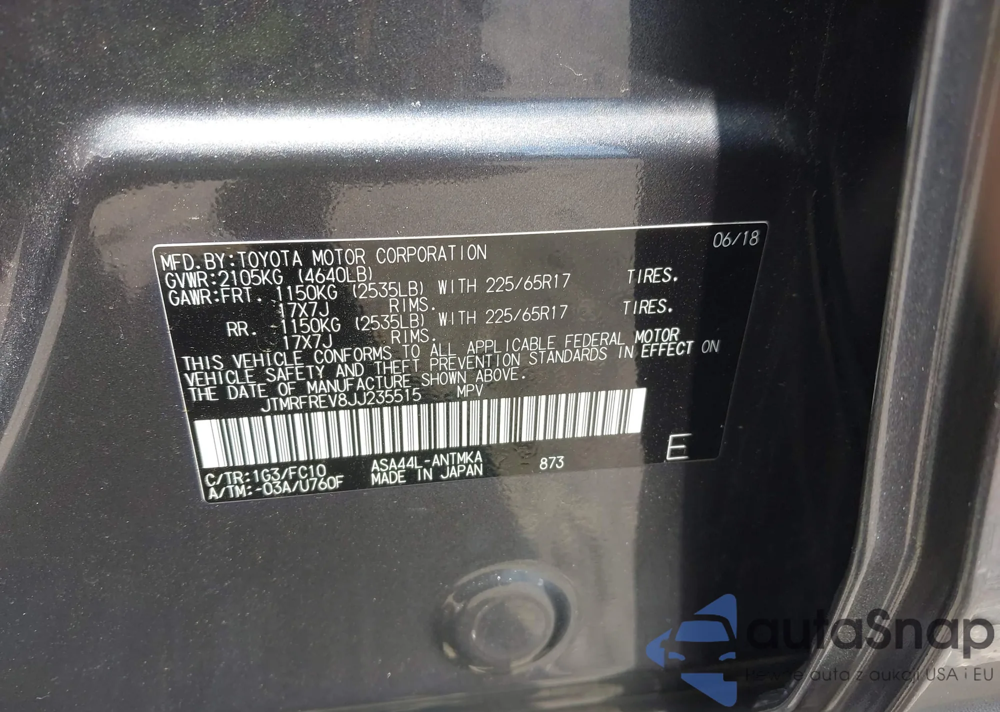 LOT: 42857118 VIN: JTMRFREV8JJ235515