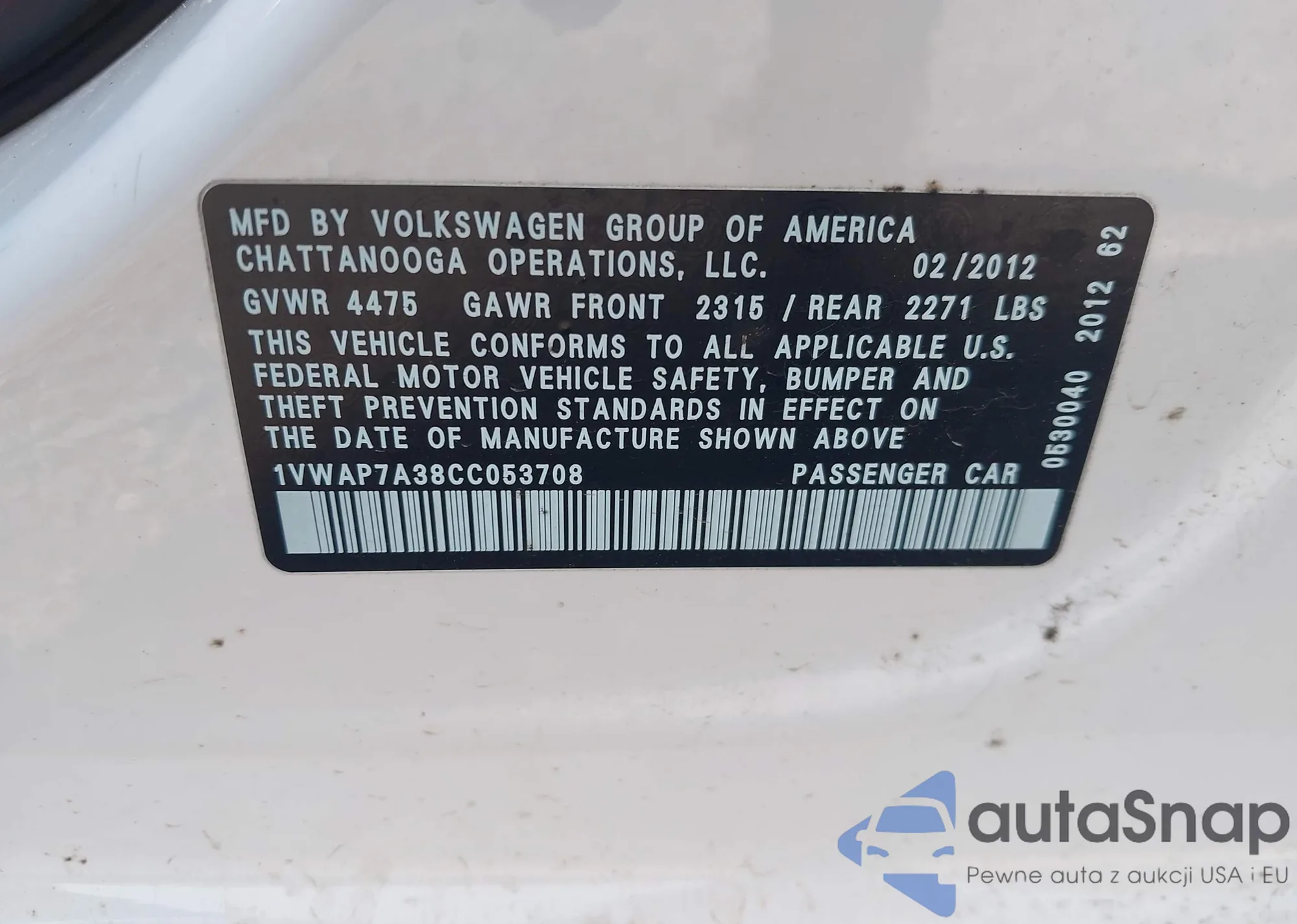 • VIN 1VWAP7A38CC053708