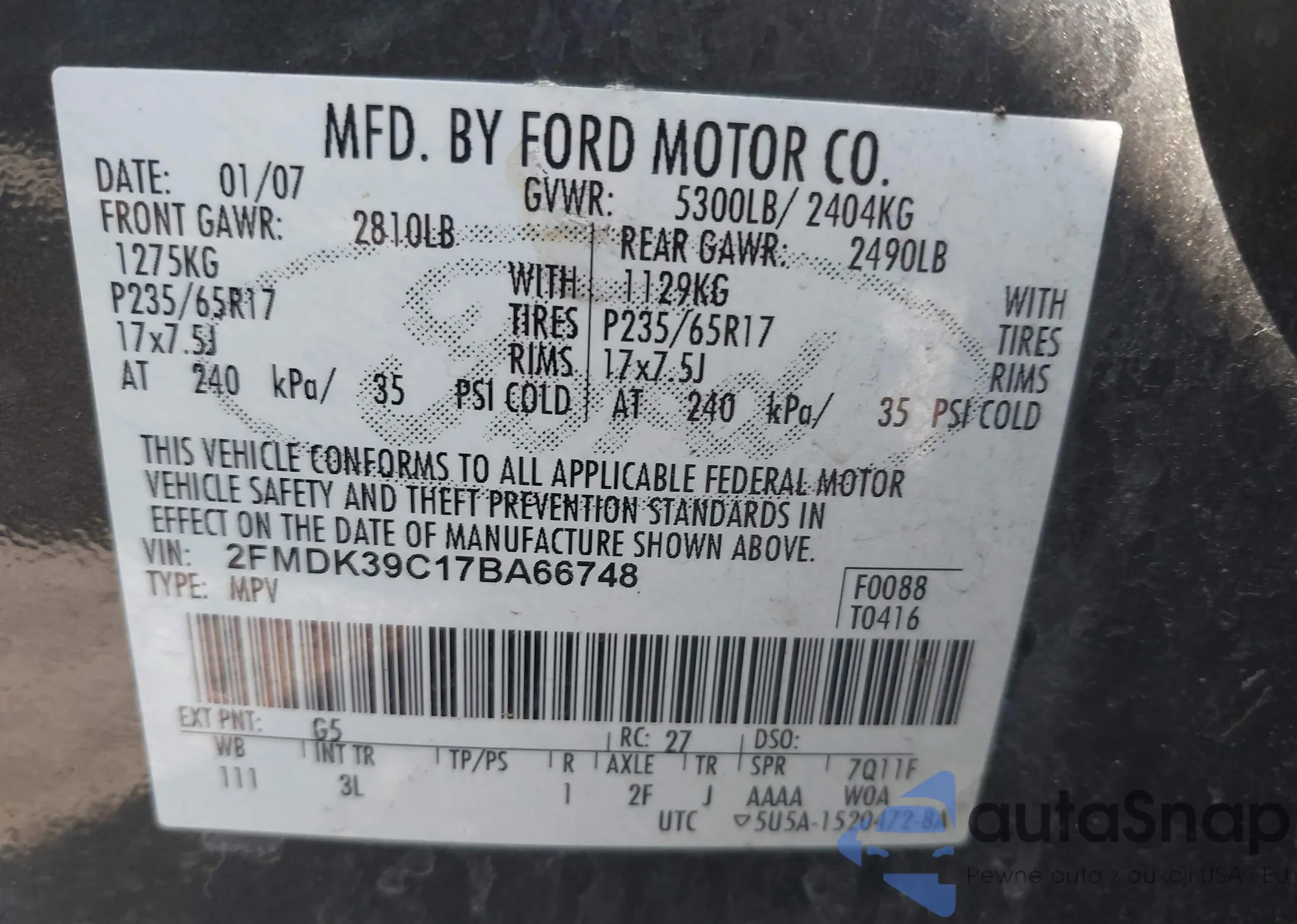 • VIN 2FMDK39C17BA66748