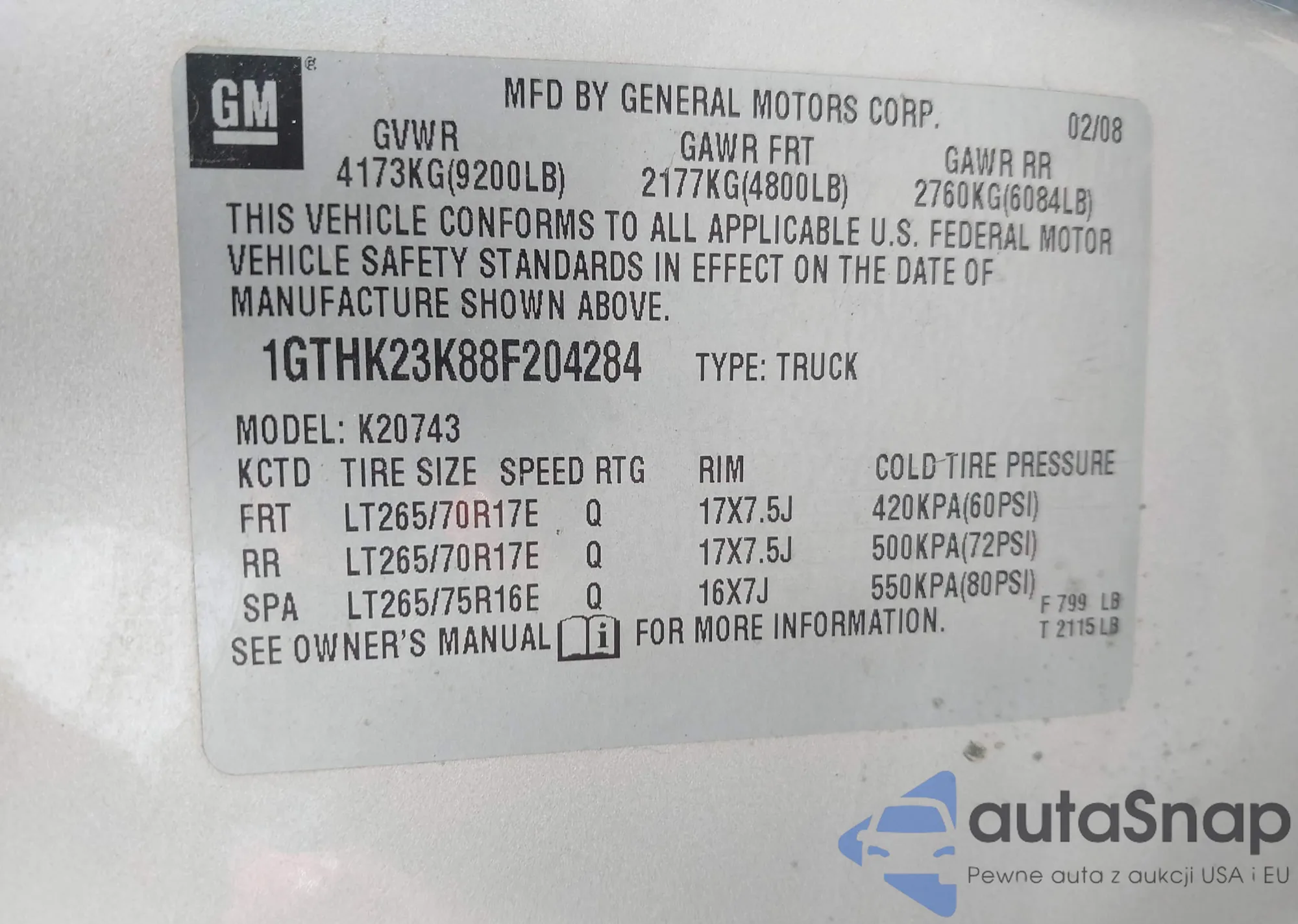 LOT: 42860478 VIN: 1GTHK23K88F204284