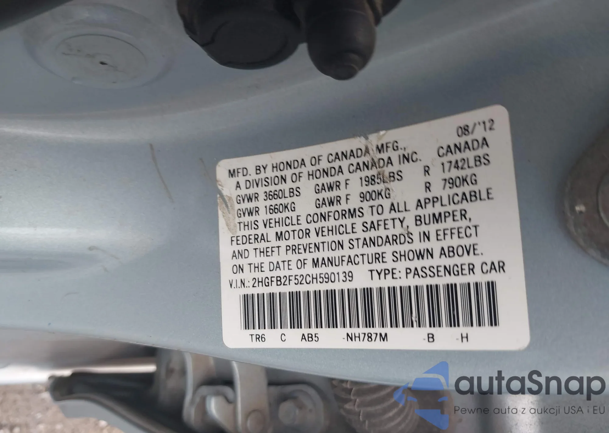 LOT: 42893653 VIN: 2HGFB2F52CH590139