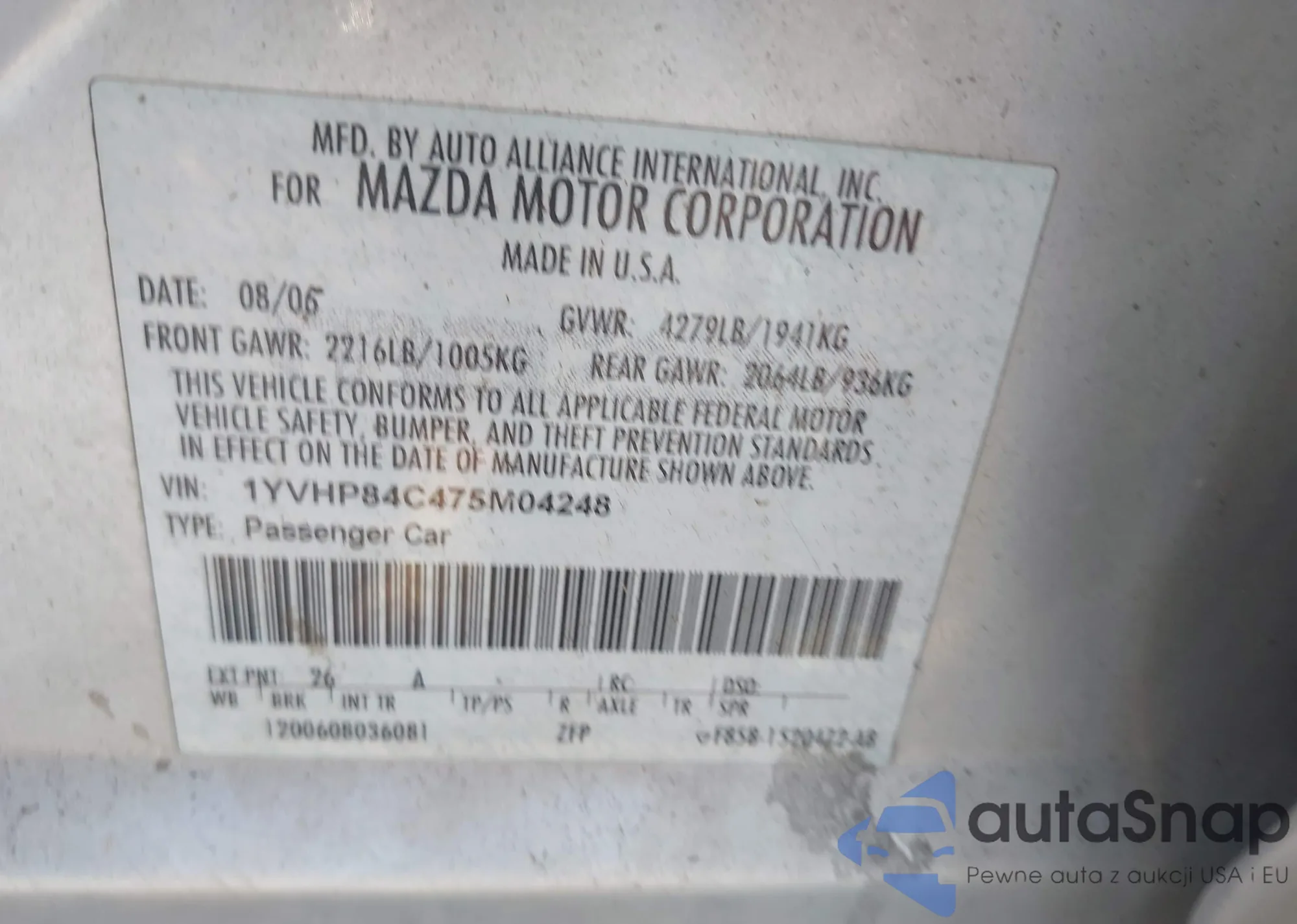 LOT: 43095909 VIN: 1YVHP84C475M04248
