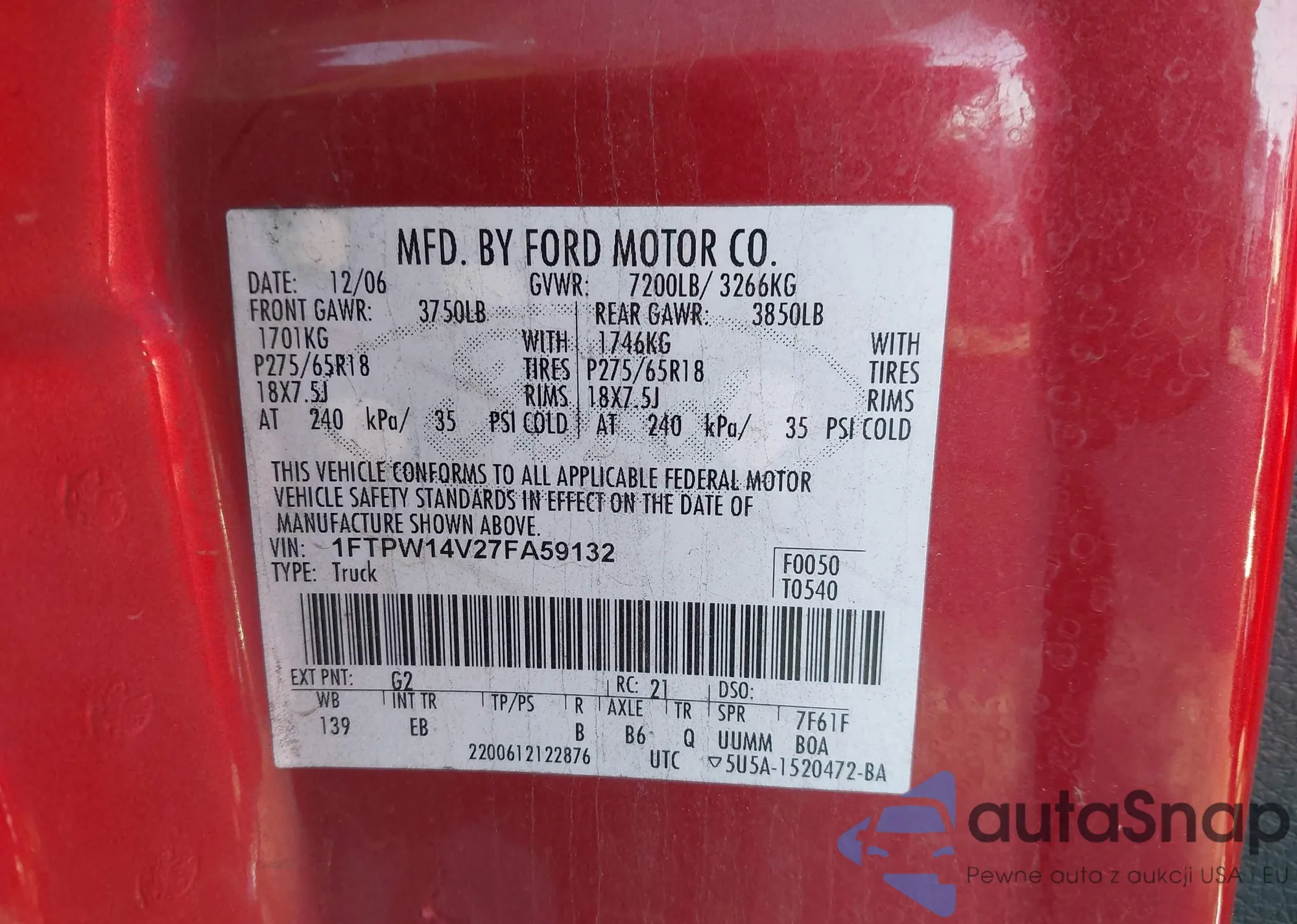 LOT: 41149366 VIN: 1FTPW14V27FA59132