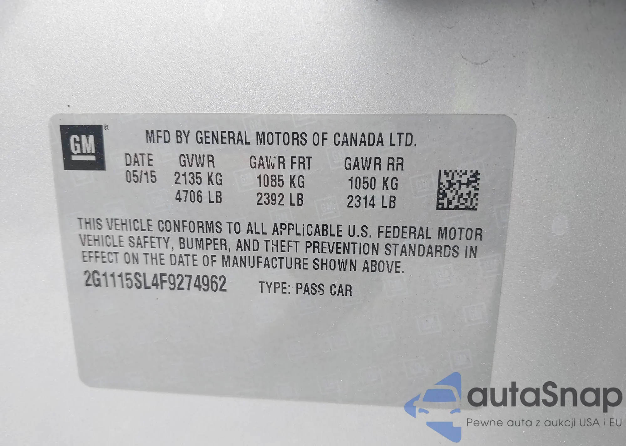 LOT: 42921465 VIN: 2G1115SL4F9274962