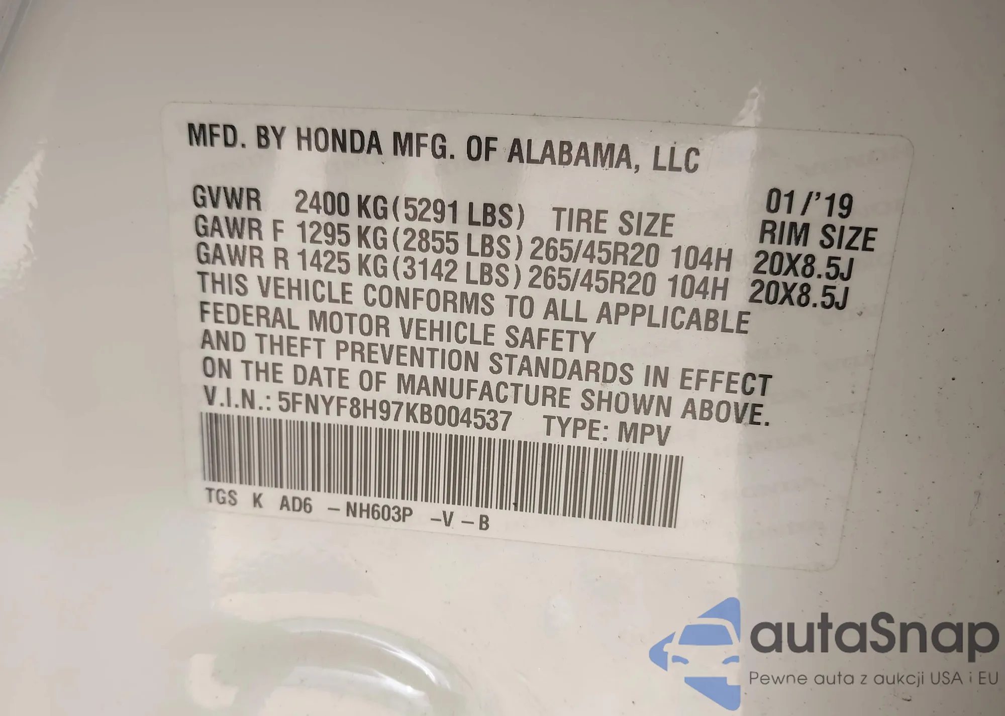 LOT: 42940649 VIN: 5FNYF8H97KB004537