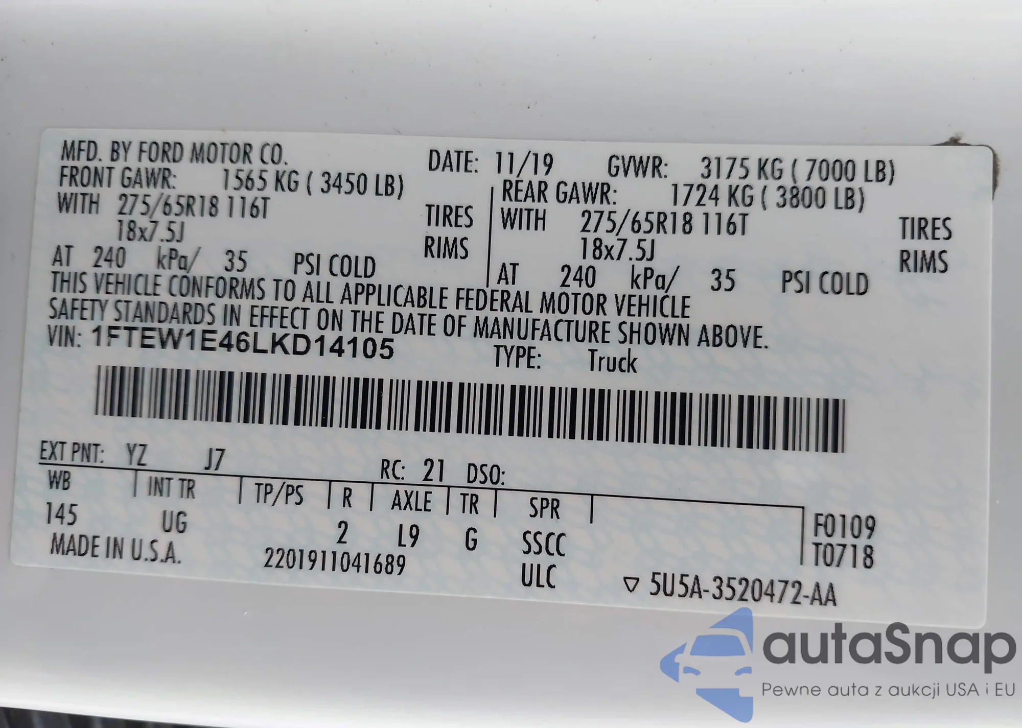 LOT: 43018951 VIN: 1FTEW1CP1LFC00227