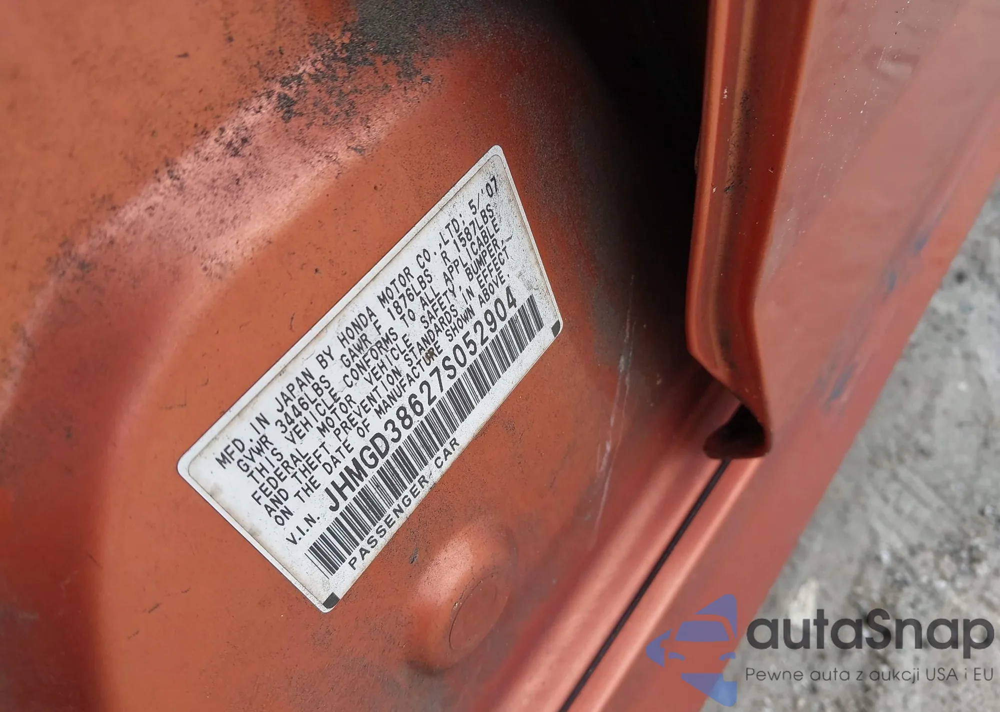 LOT: 42962626 VIN: JHMGD38627S052904