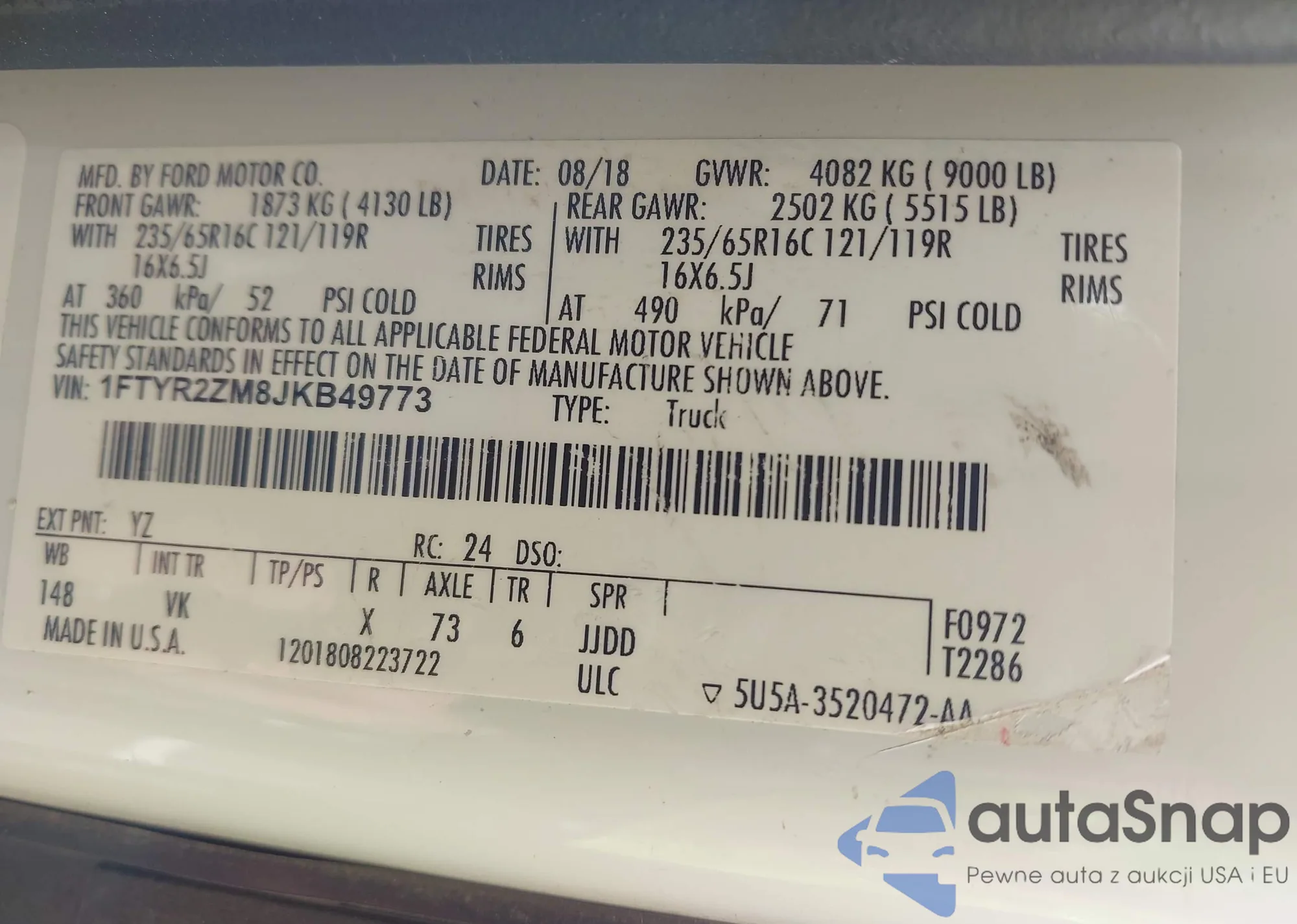 • VIN 1FTYR2ZM8JKB49773