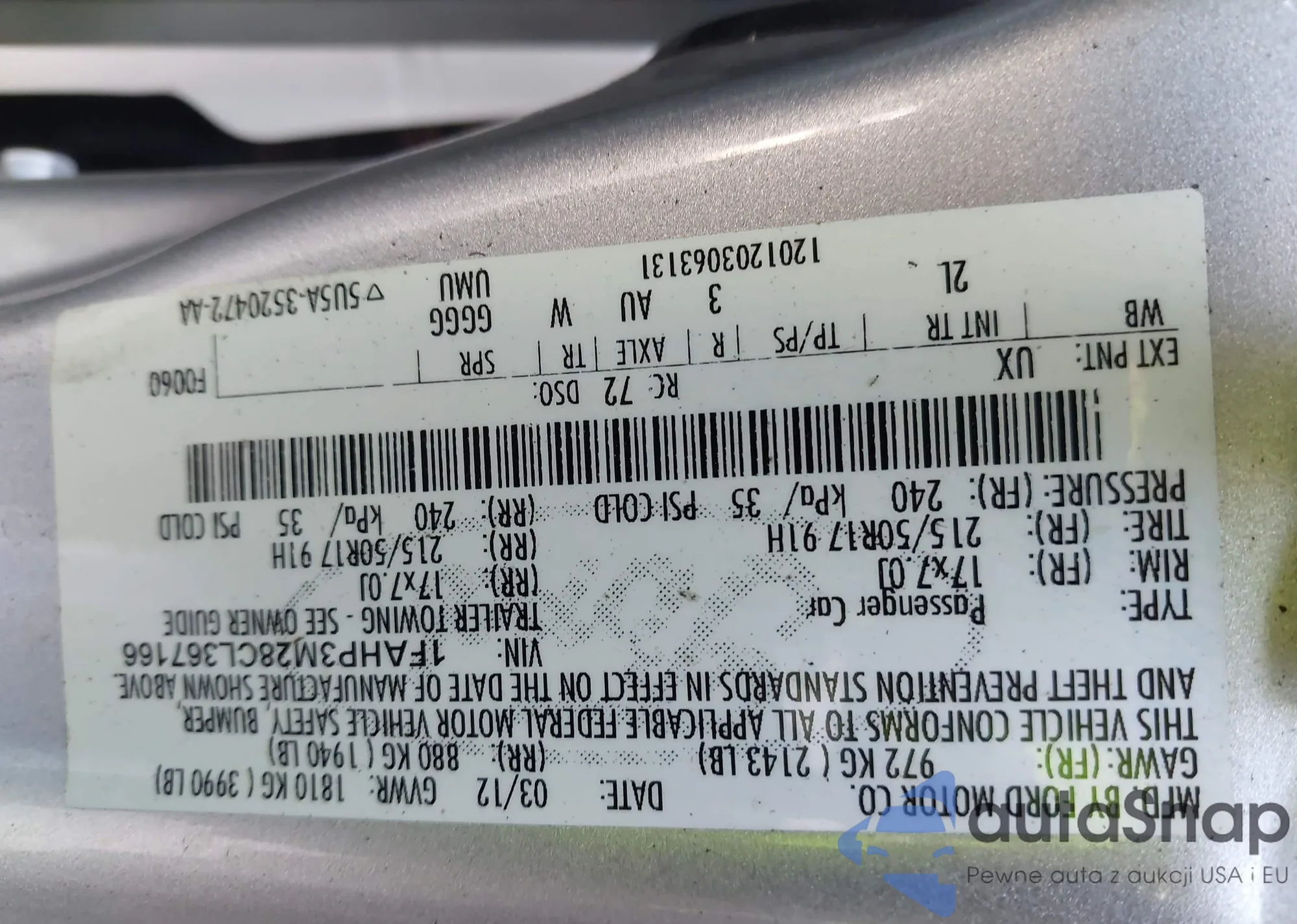 LOT: 43093221 VIN: 1FAHT3M28CL367166