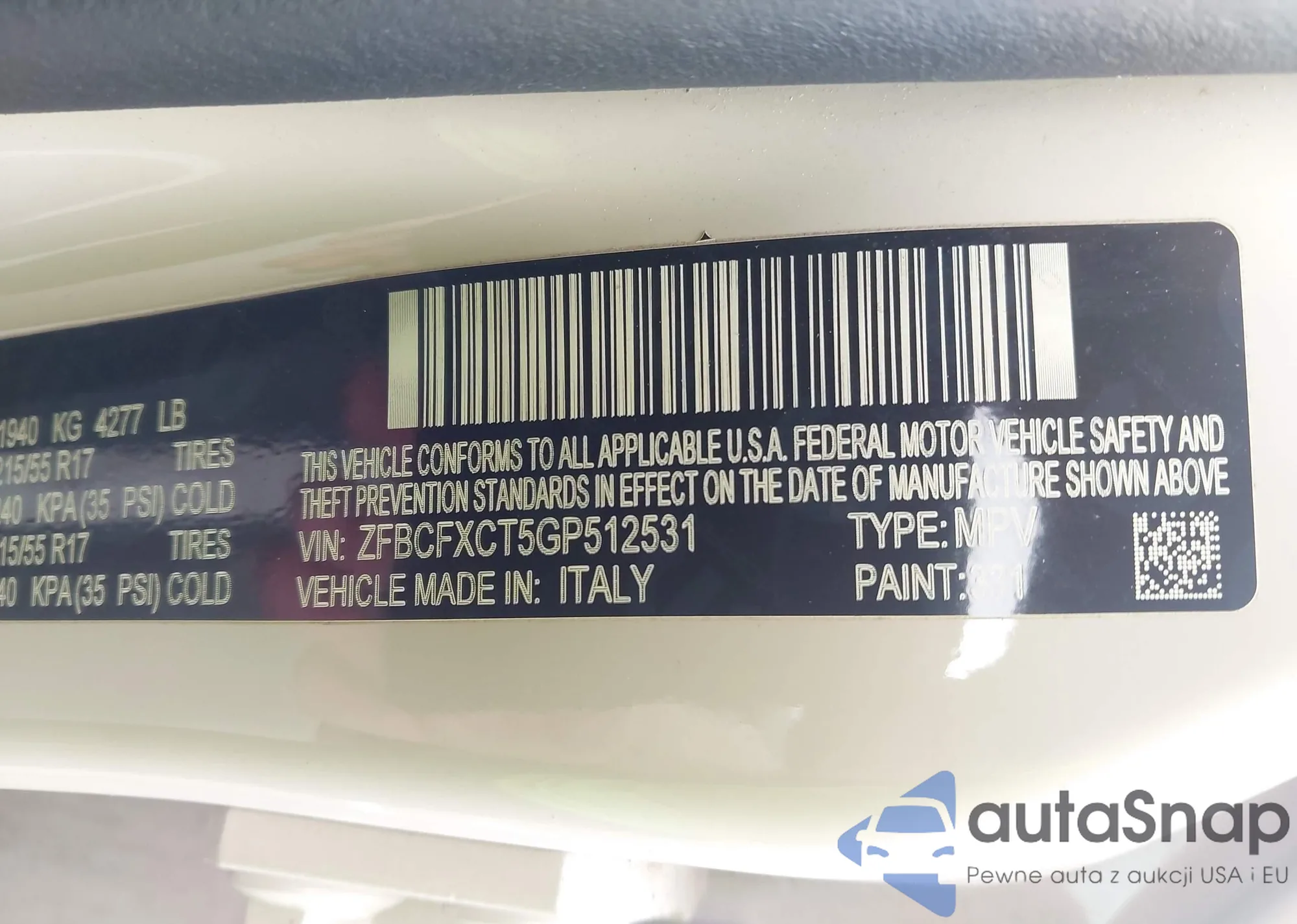 LOT: 43172604 VIN: ZFBCFXCT5GP512531