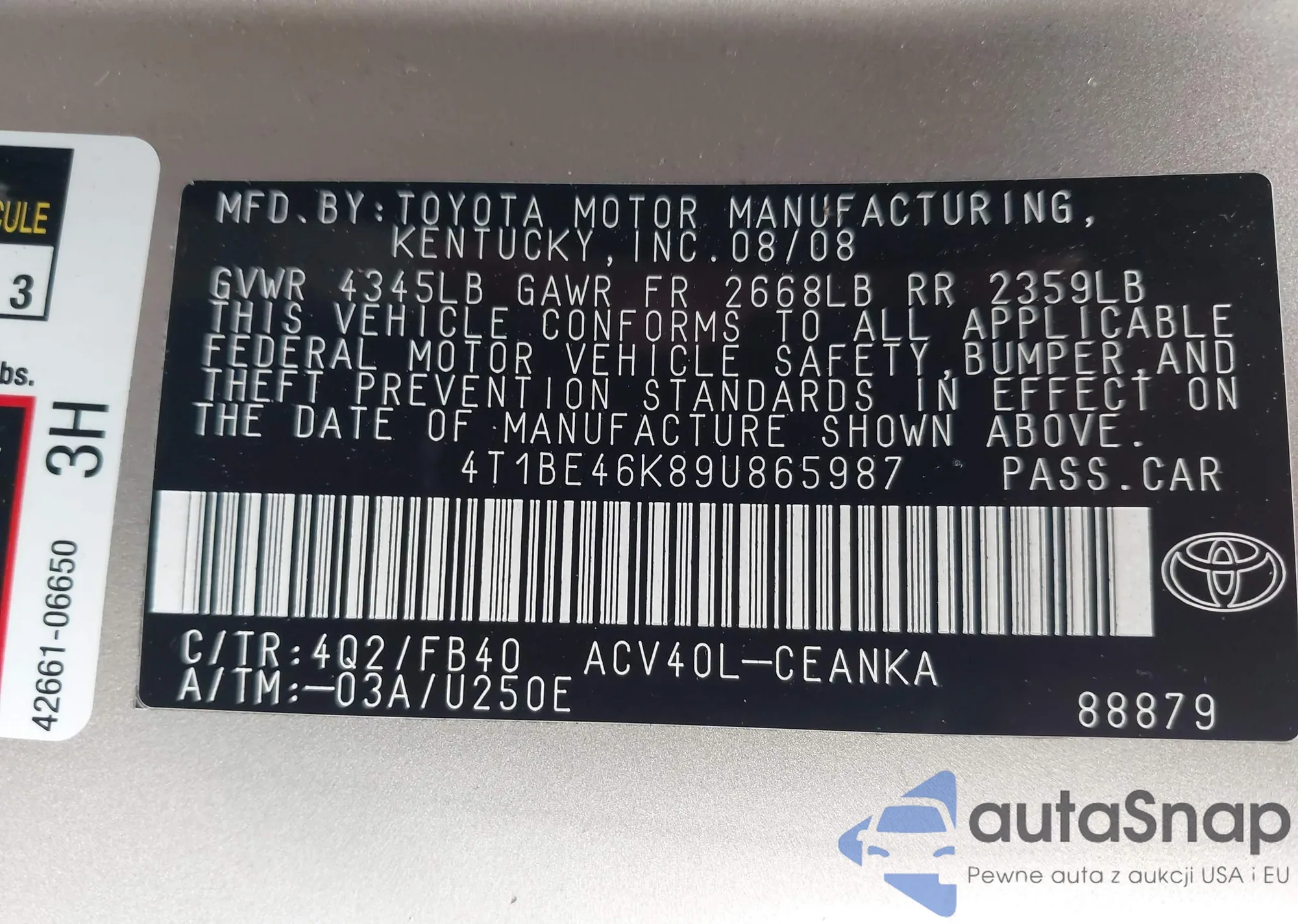 LOT: 43180369 VIN: 4T1BE46K89U865987
