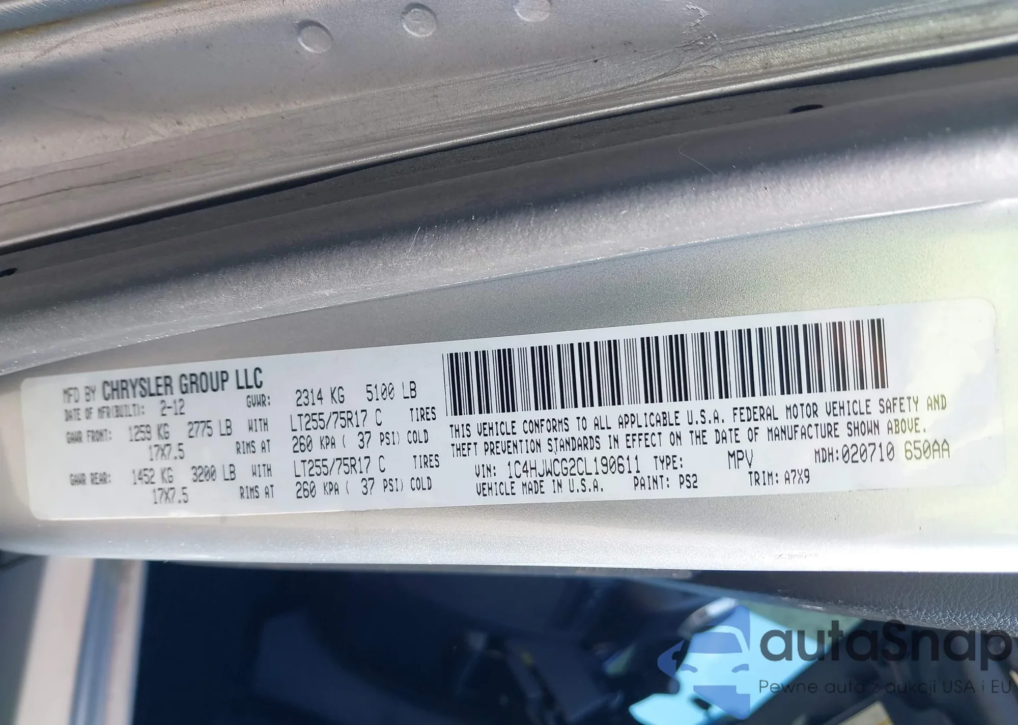 LOT: 43205687 VIN: 1C4HJWCG2CL190611