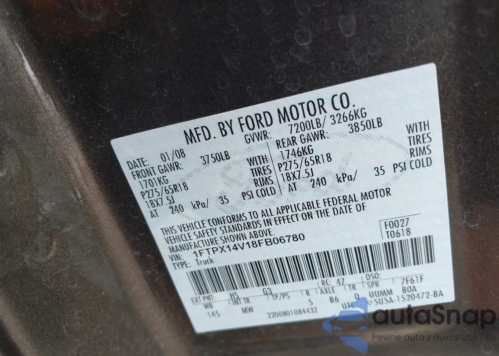 LOT: 43000886 VIN: 5FNYF28368B016731