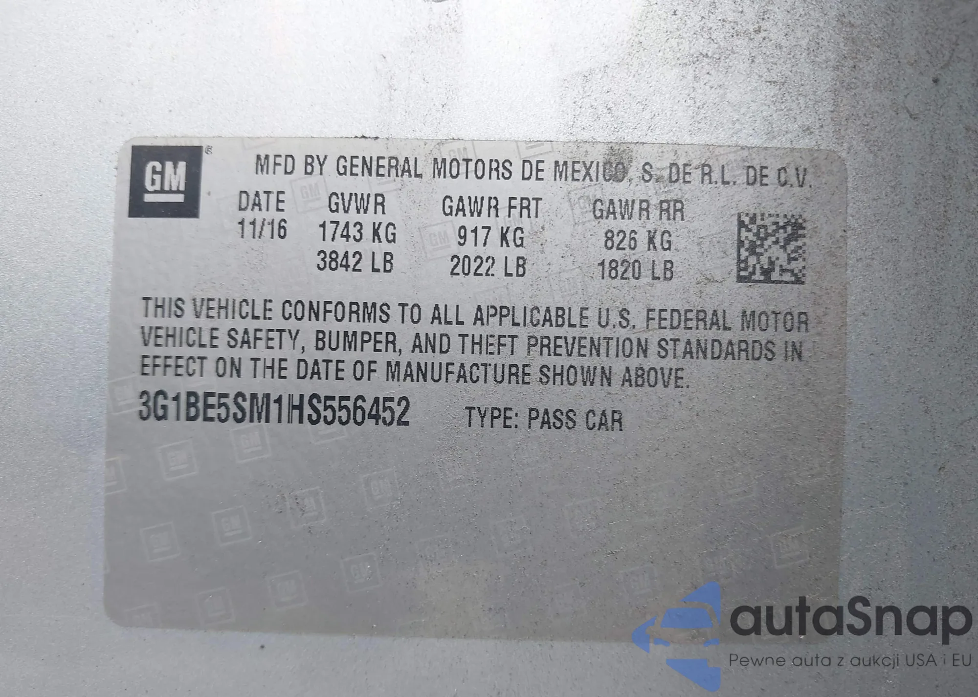 LOT: 43135330 VIN: 3G1BE5SM1HS556452