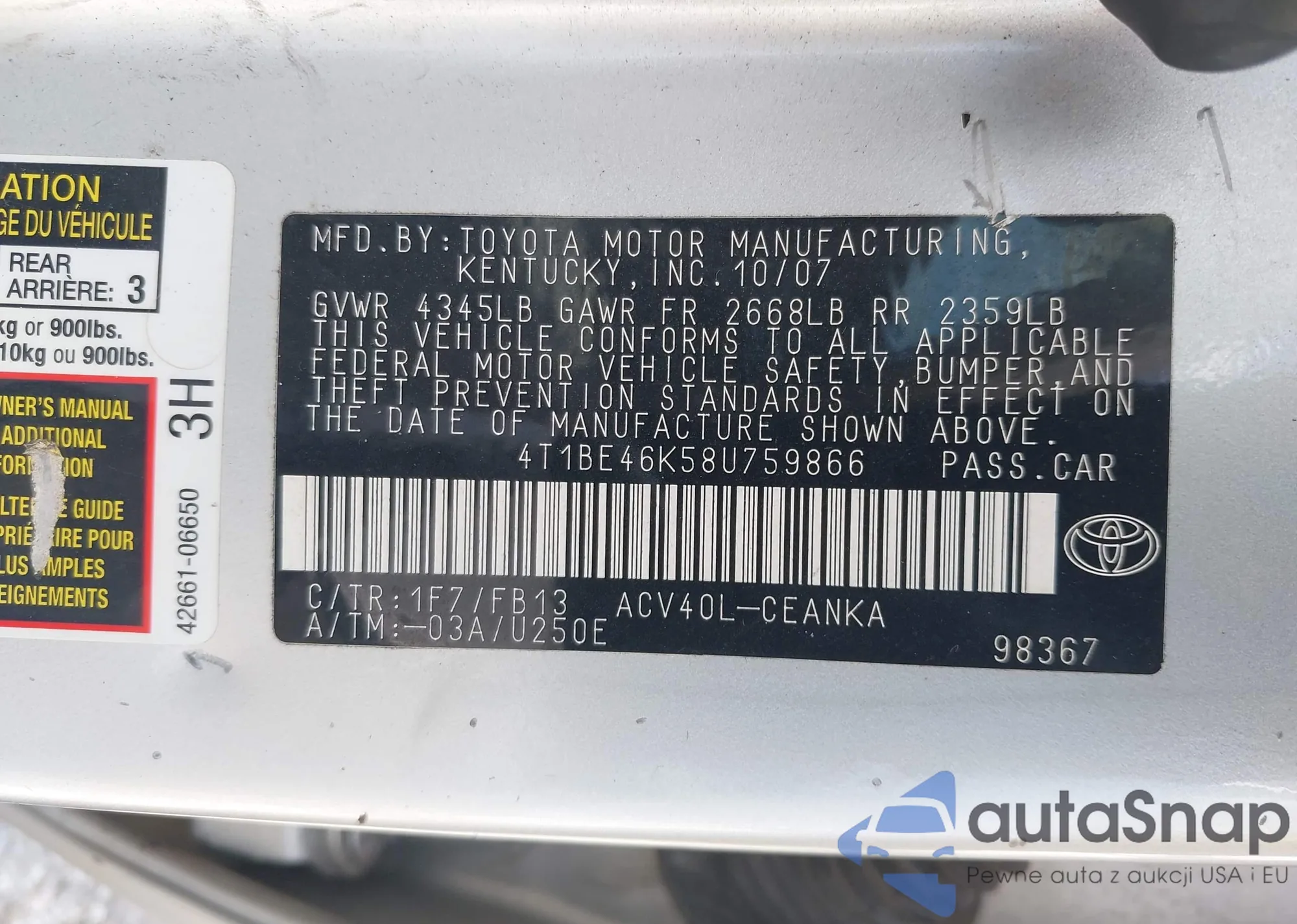 LOT: 43231433 VIN: 4T1BE46K58U759866