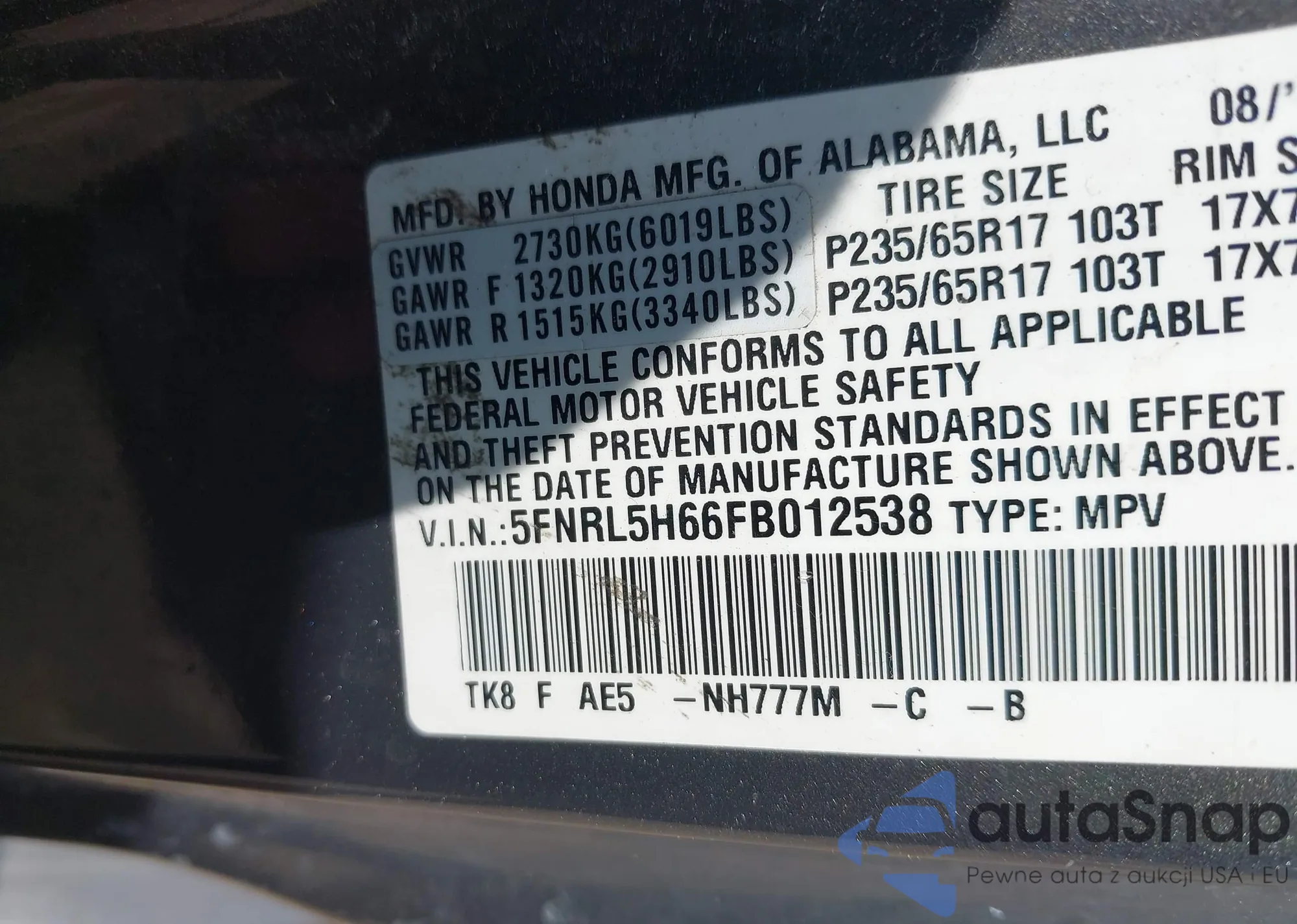 • VIN 5FNRL5H66FB012538