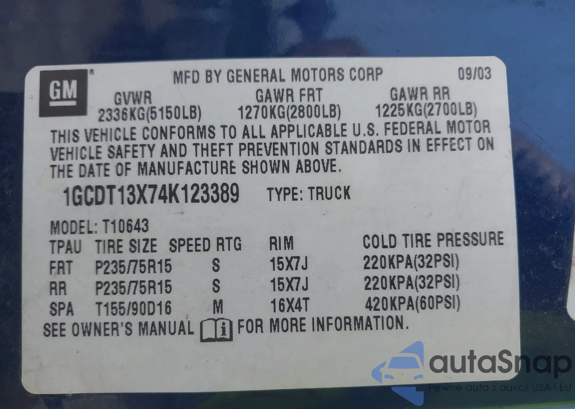 • VIN 1GCDT13X74K123389