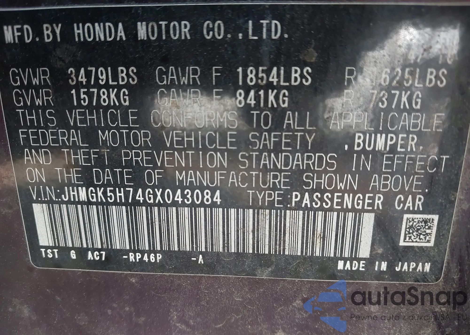 • VIN JHMGK5H74GX043084