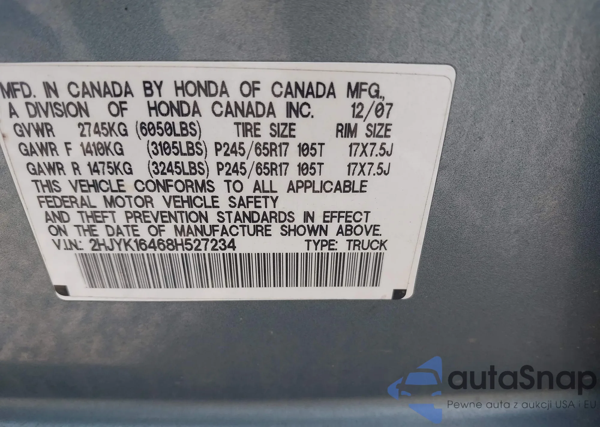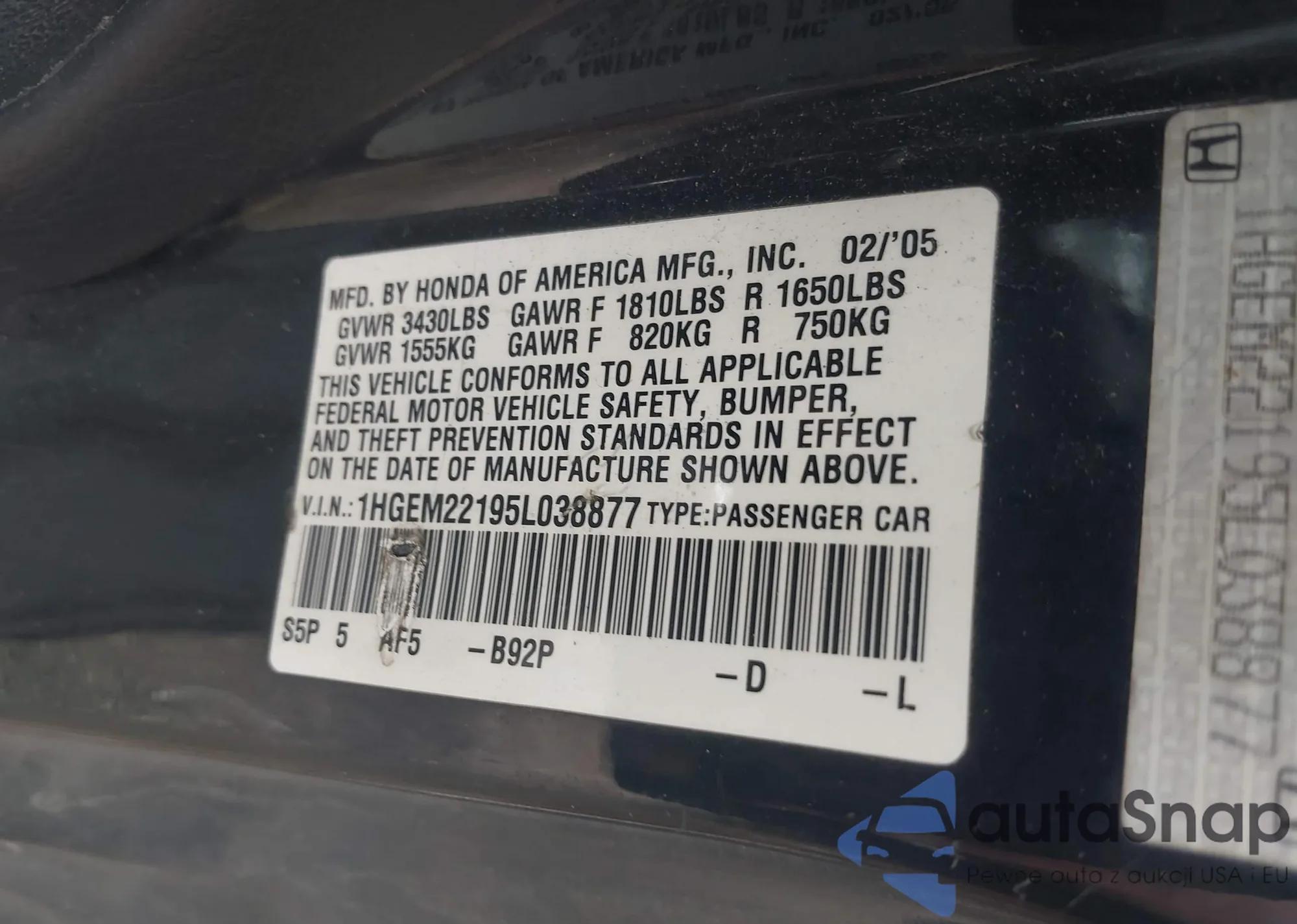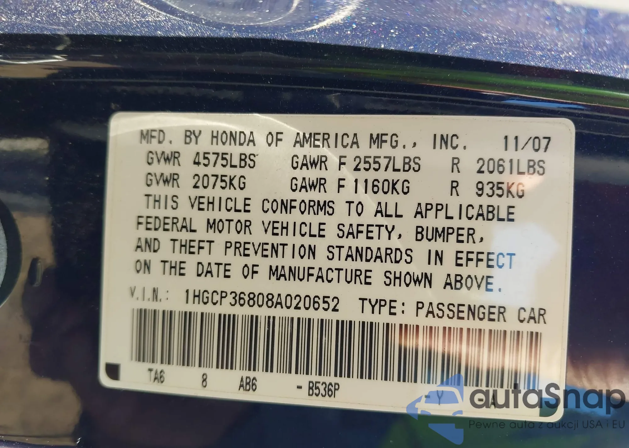 LOT: 43103313 VIN: 1HGCP36808A020652