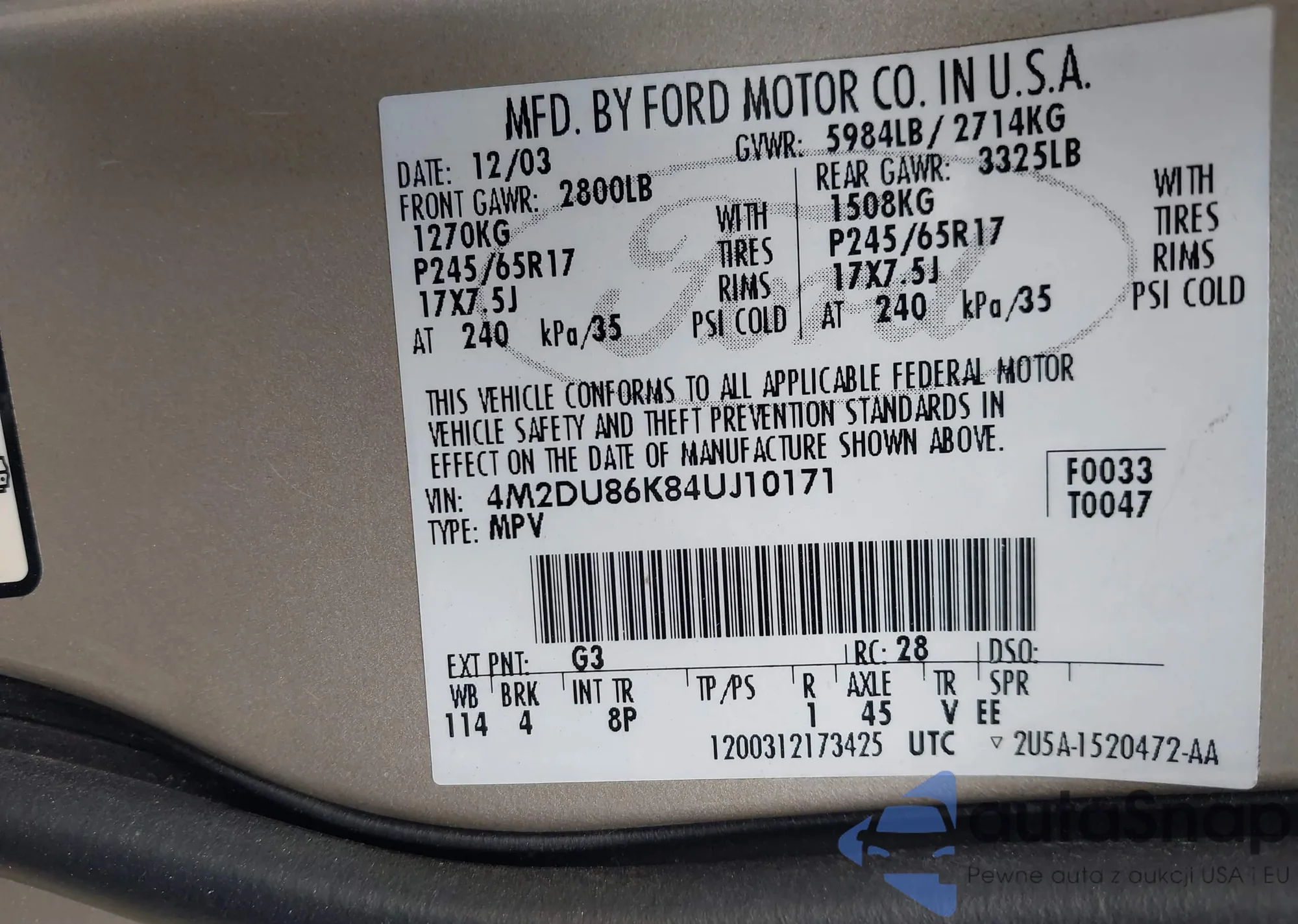 • VIN 4M2DU86K840J10171