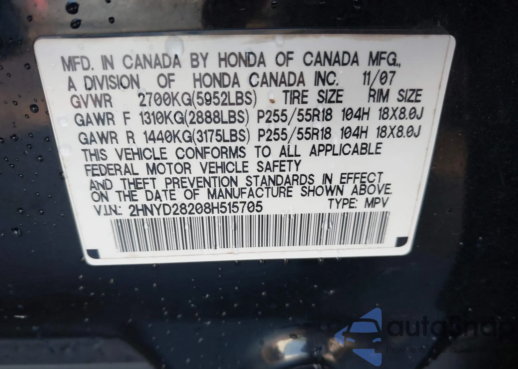 • VIN 2HNYD28208H515705