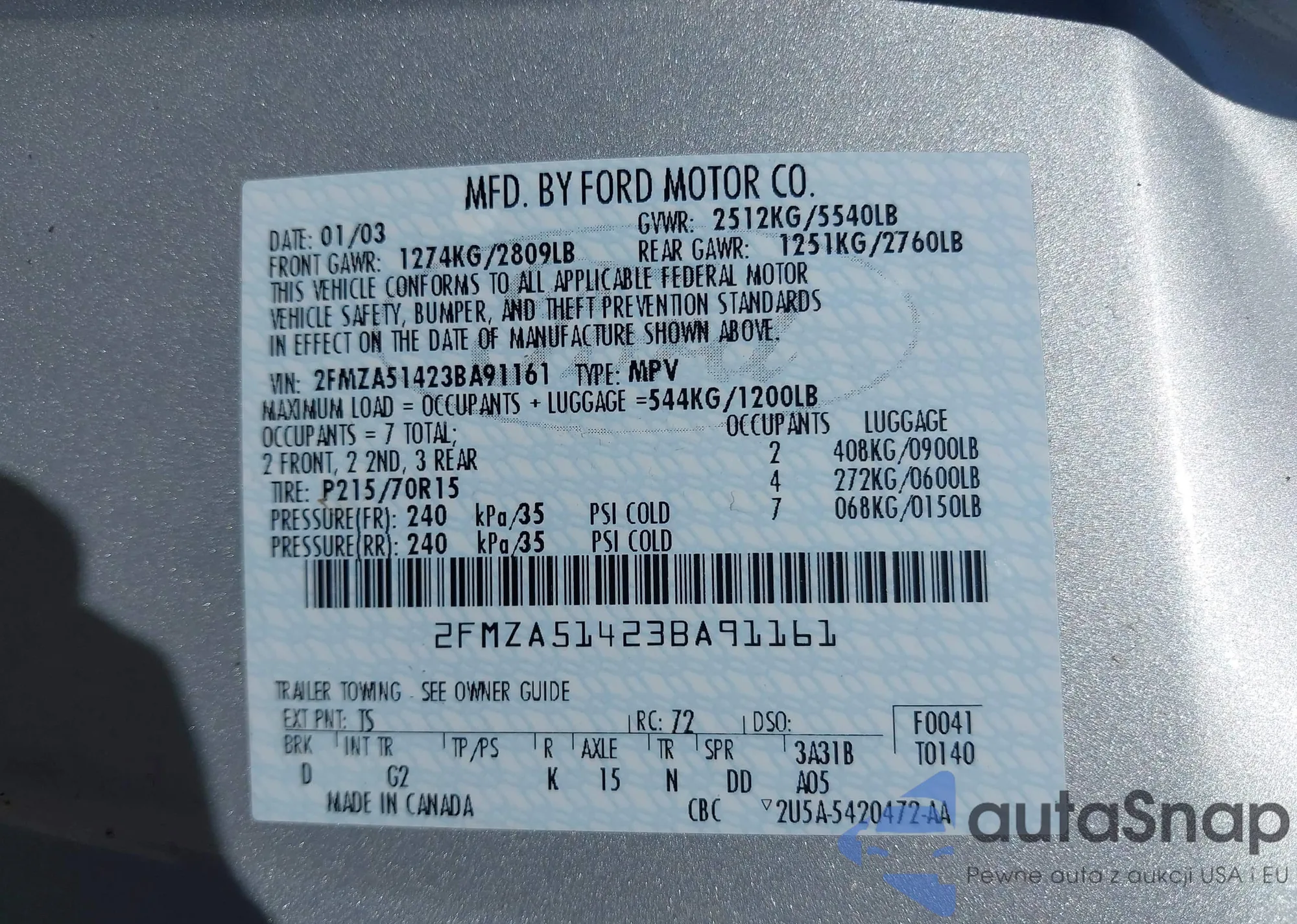 • VIN 2FMZA51423BA91161