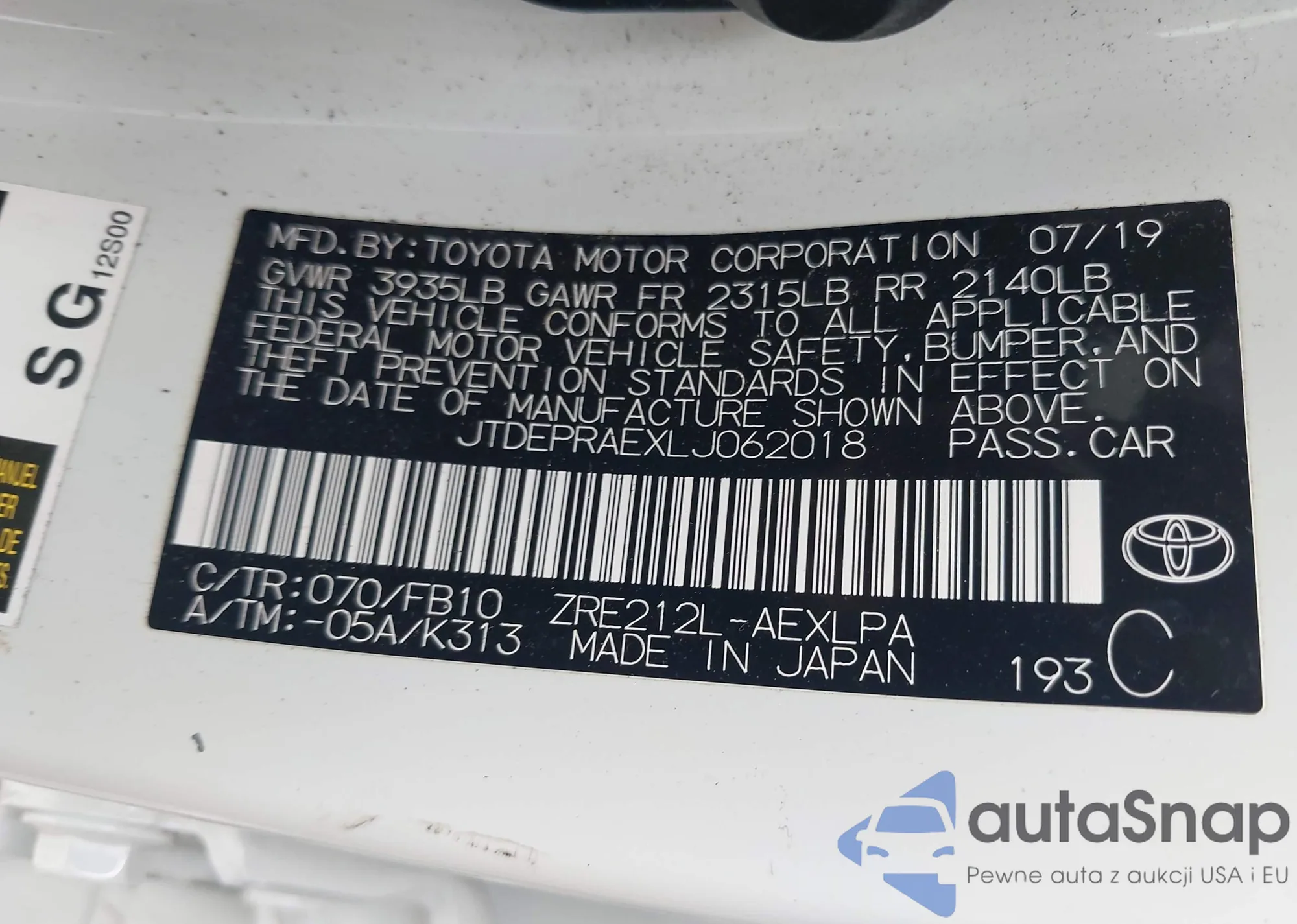 LOT: 42512731 VIN: JTDEPRAEXLJ062018