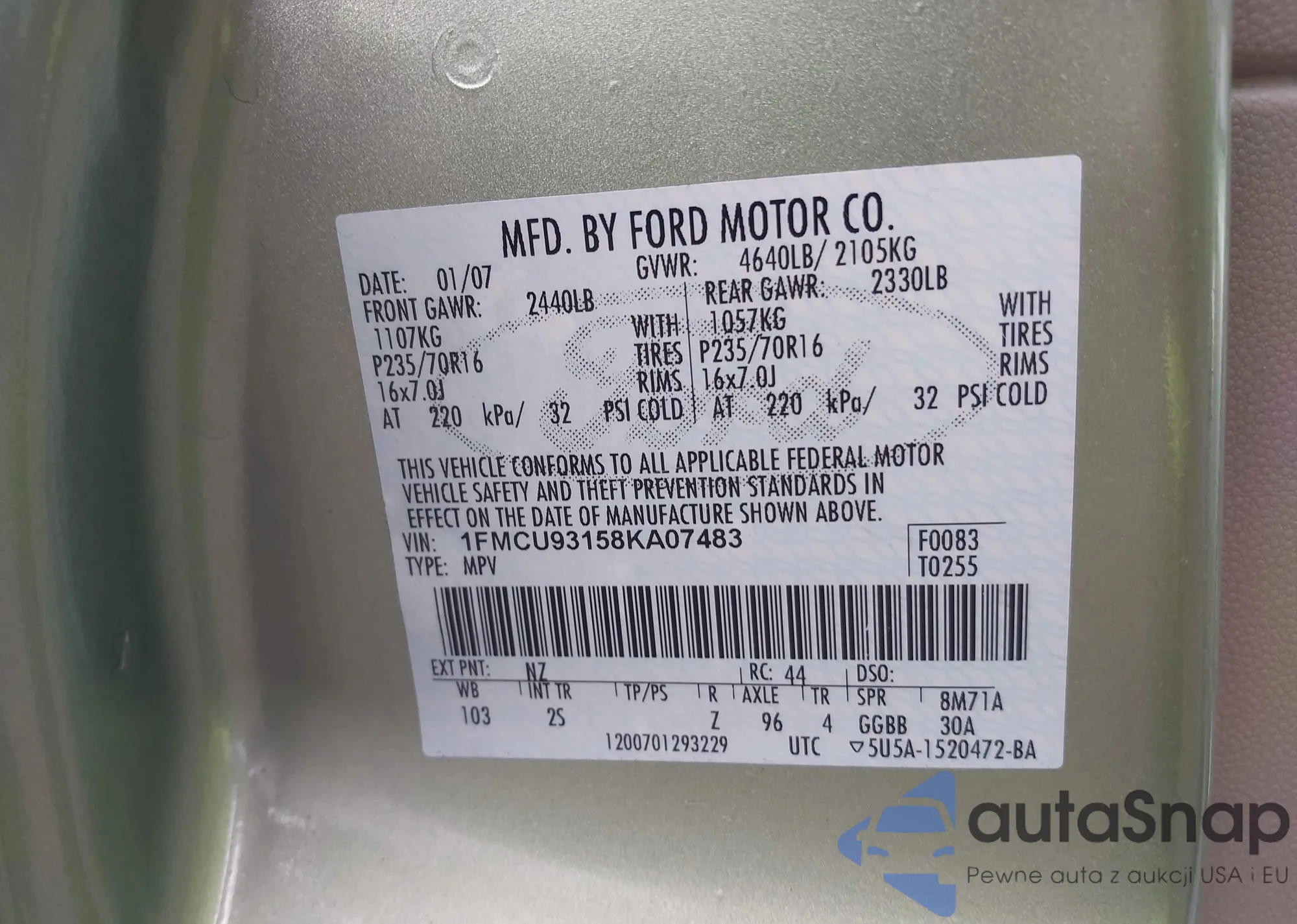 LOT: 42727761 VIN: 1FMCU93158KA07483