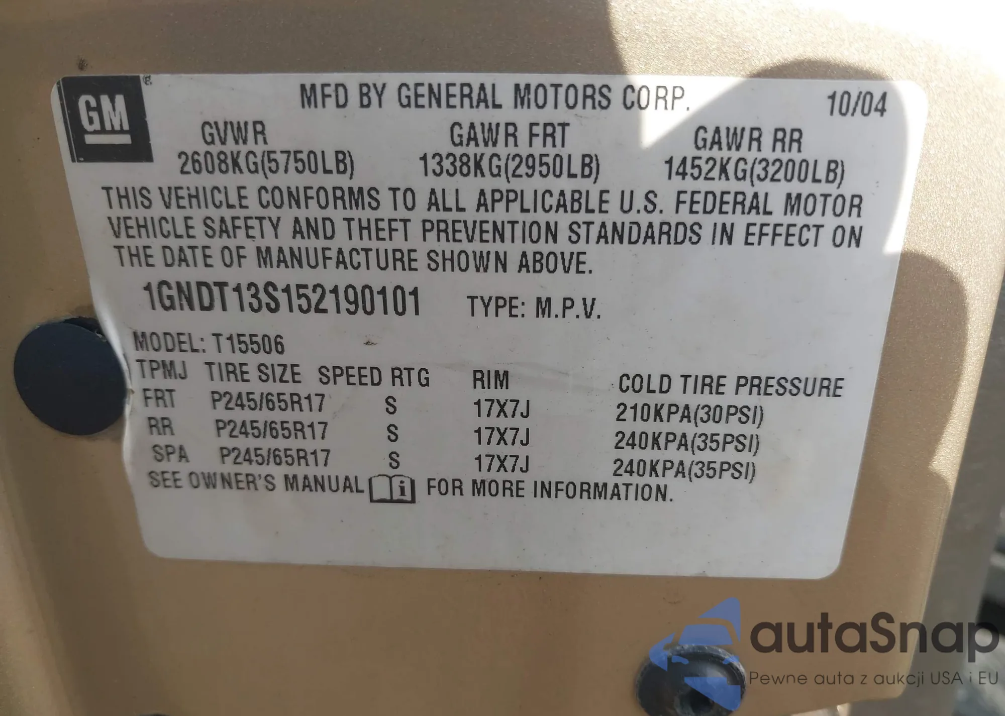 LOT: 42858279 VIN: 1GNDT13S152190101