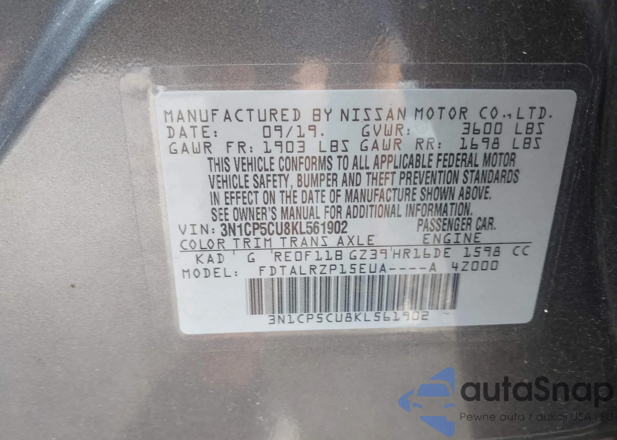 LOT: 42907560 VIN: 3N1CP5CU8KL561902