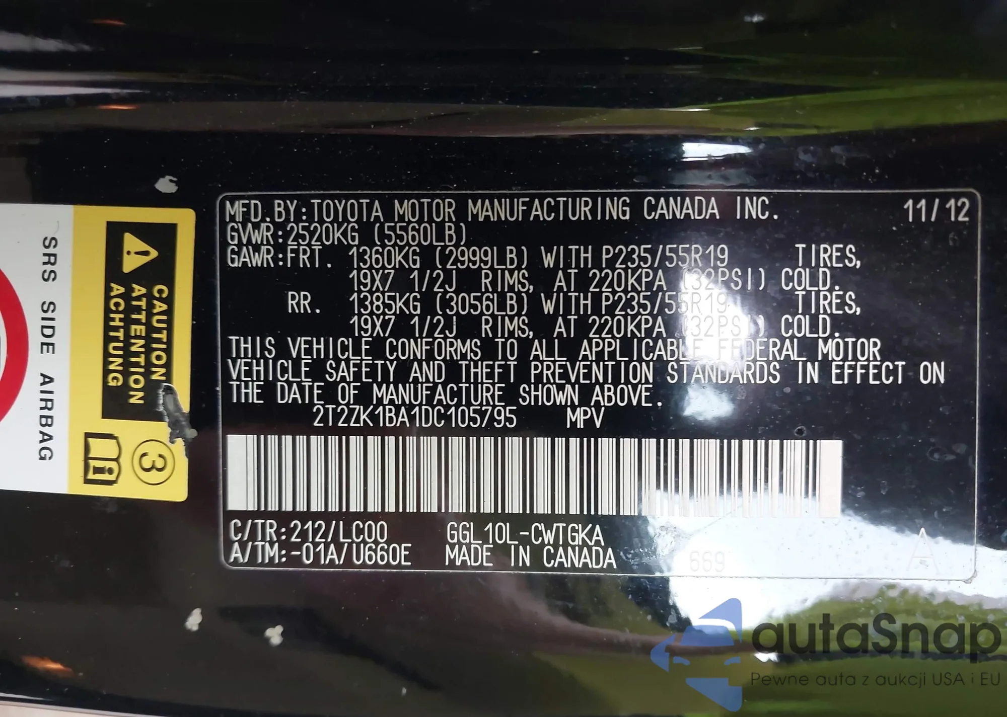 • VIN 2T2ZK1BA1DC105795