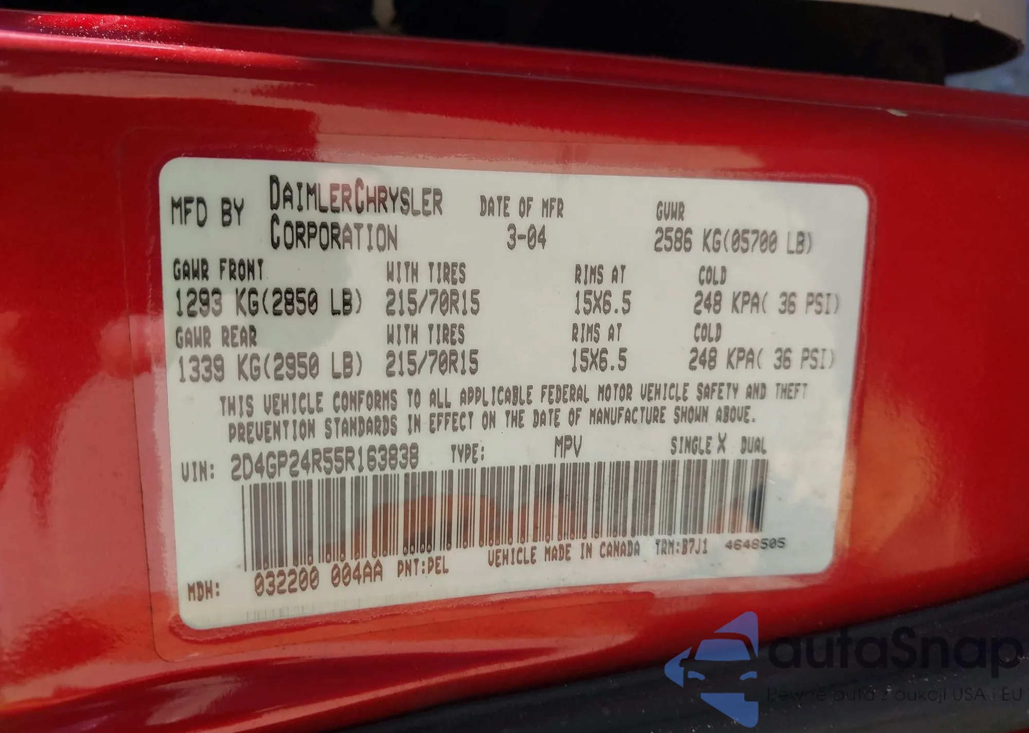 LOT: 43018603 VIN: 2D4GP24R55R163838