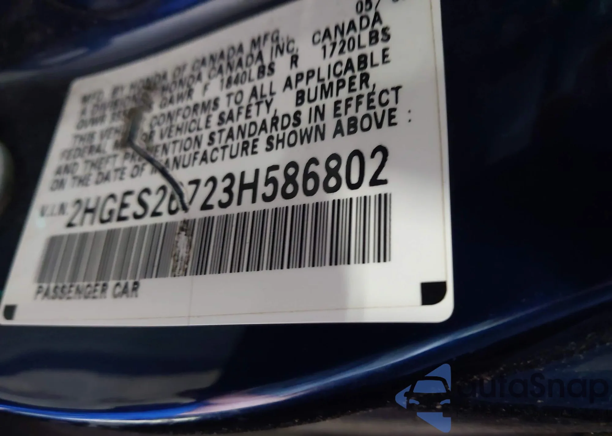 LOT: 43024860 VIN: 2HGES26723H586802
