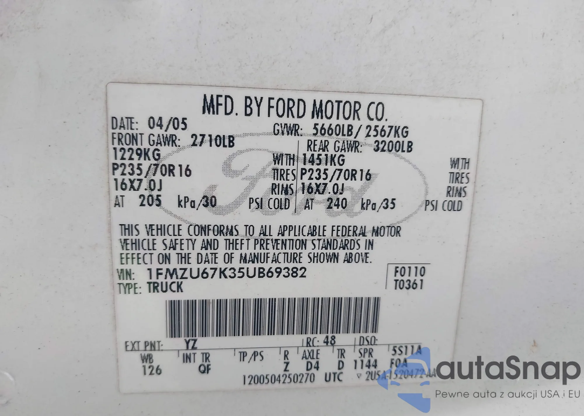 • VIN 1FTYR14V4YPA37317