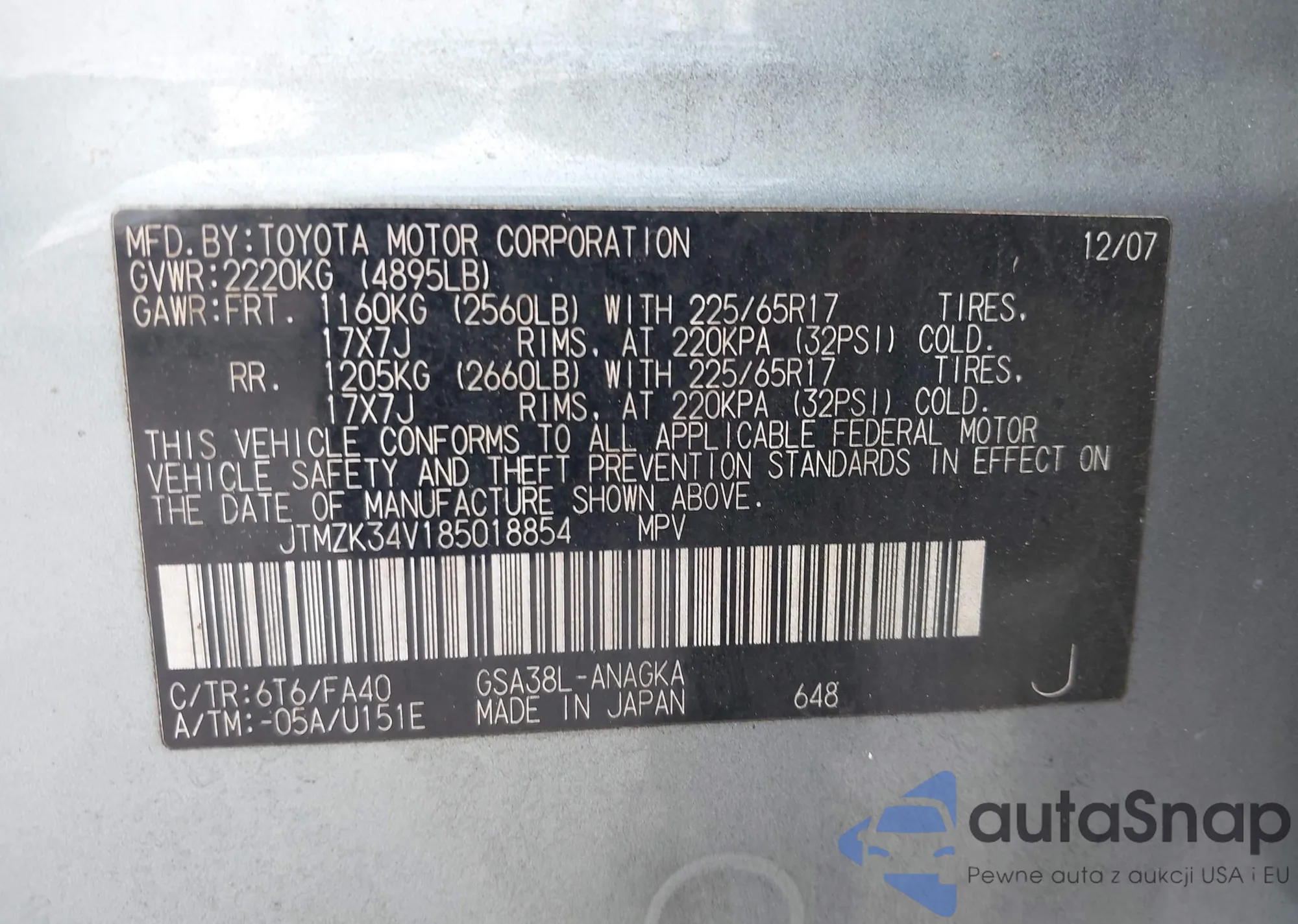 LOT: 43080155 VIN: JTMZK34V185018854