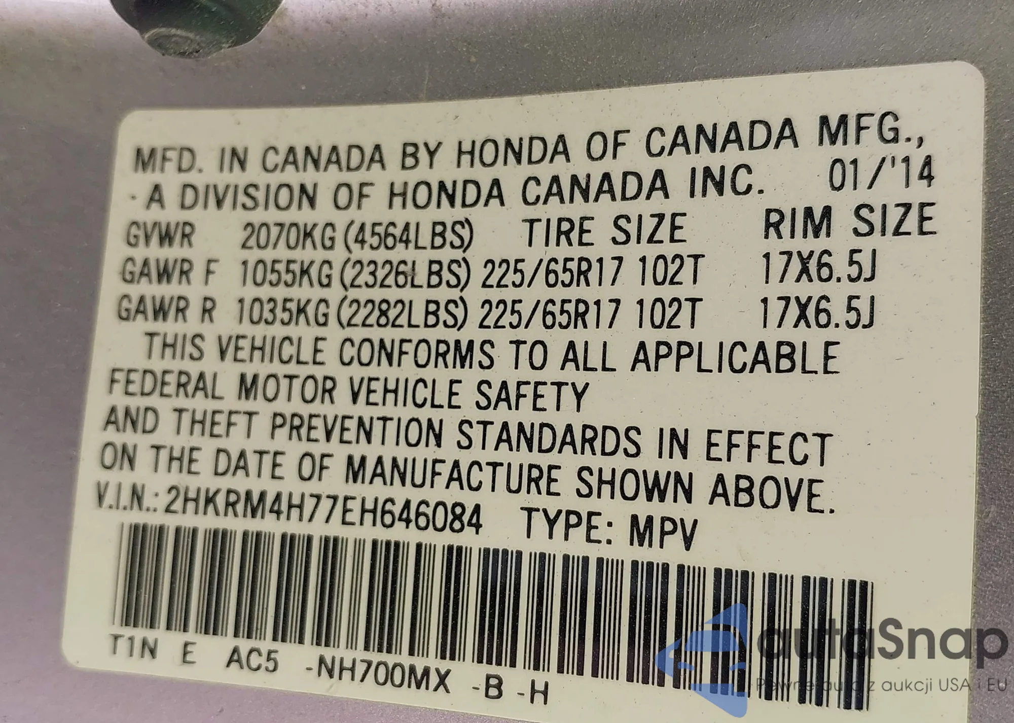 • VIN 2HKRM4H77EH646084