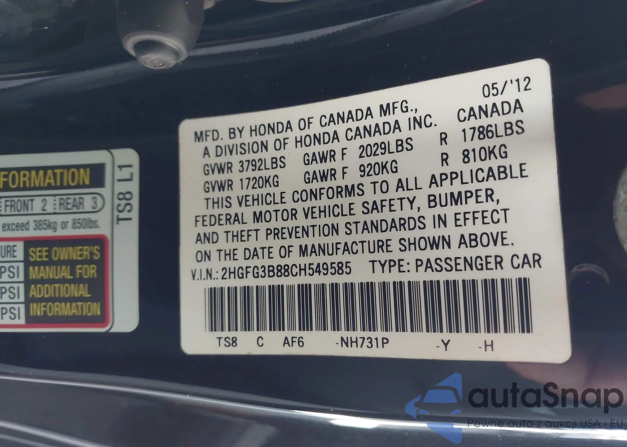 • VIN 2HGFG3B88CH549585