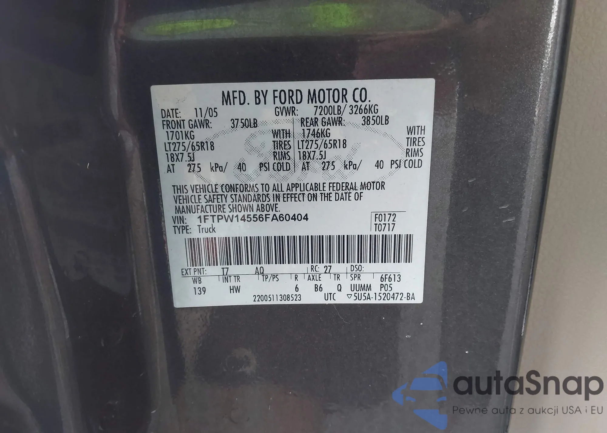 LOT: 42957704 VIN: 1FTPW14556FA60404