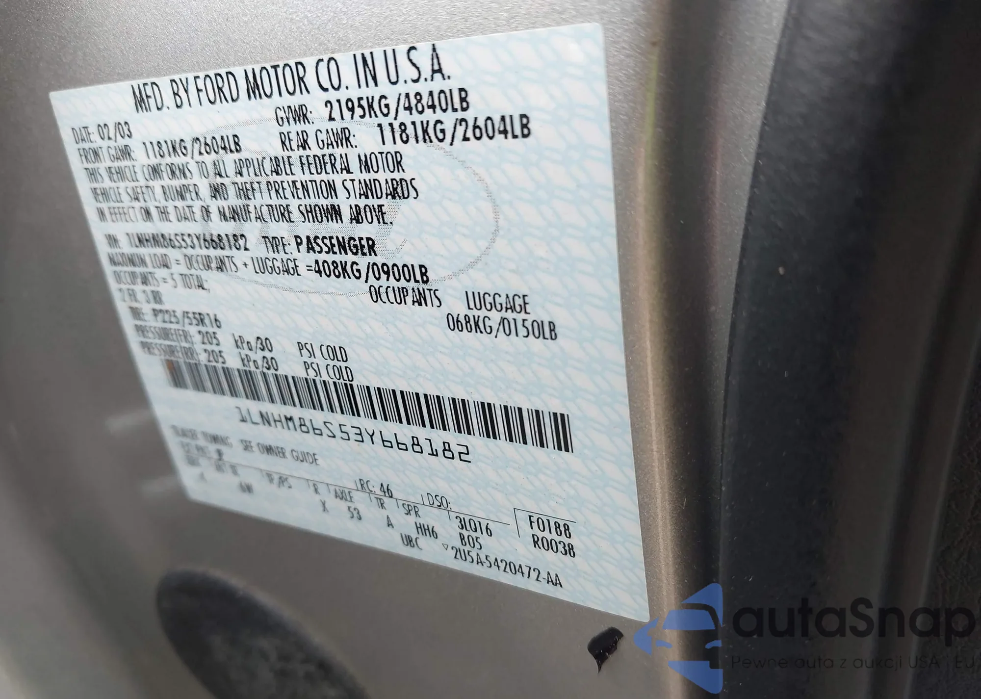 LOT: 43115846 VIN: 1LNHM86S53Y668182