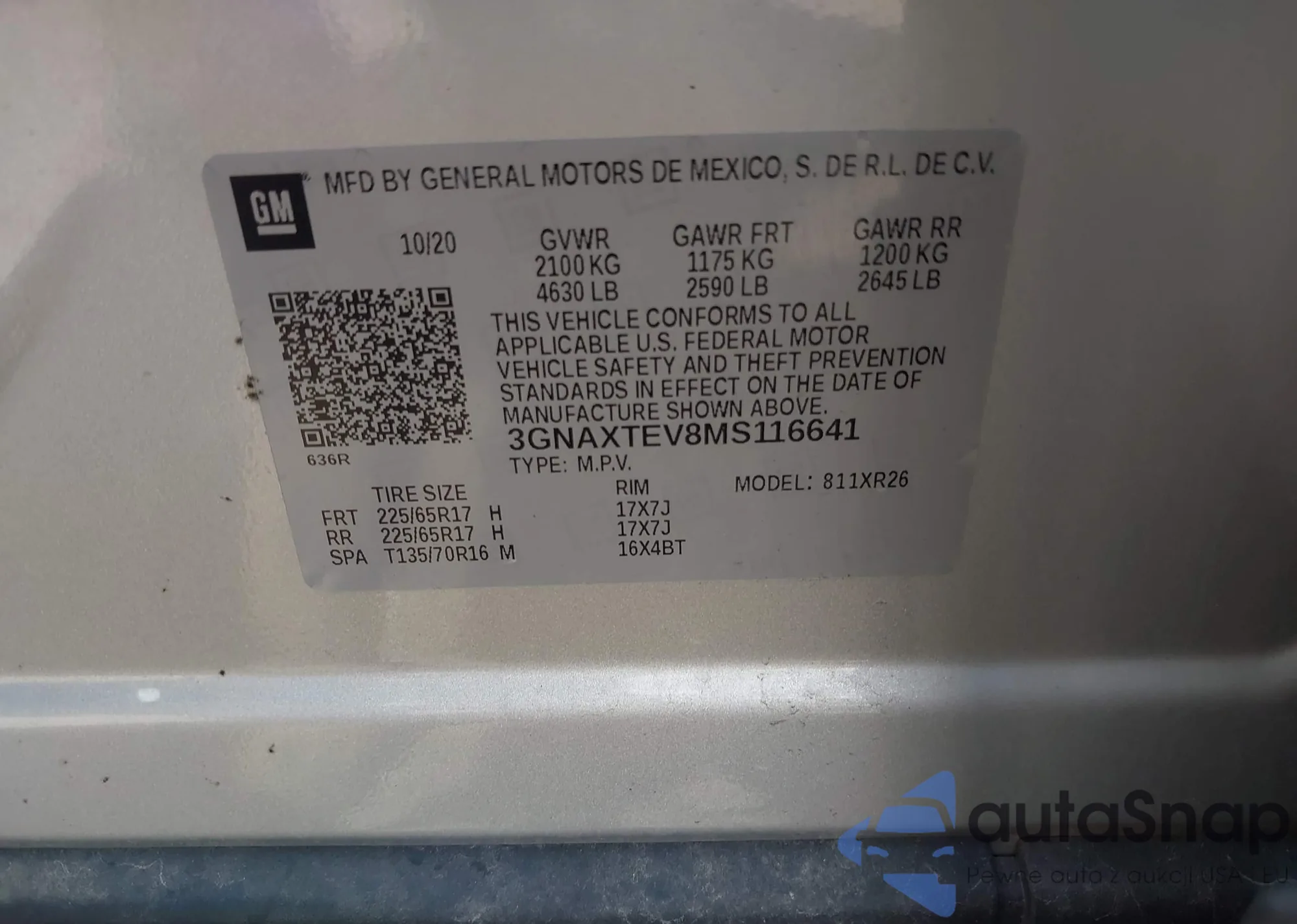 LOT: 42733085 VIN: 3GNAXTEV8MS116641