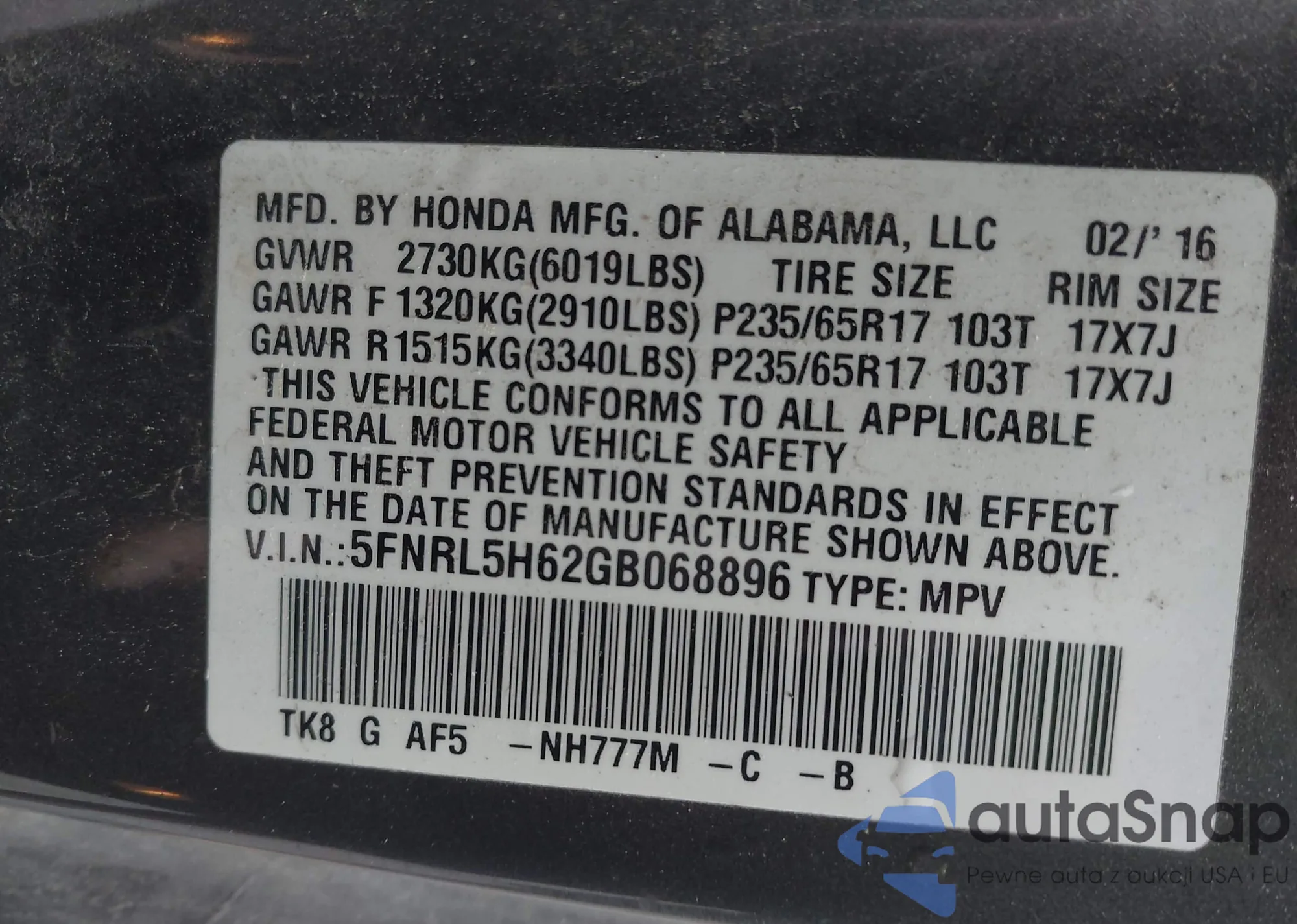 • VIN 5FNRL5H62GB068896