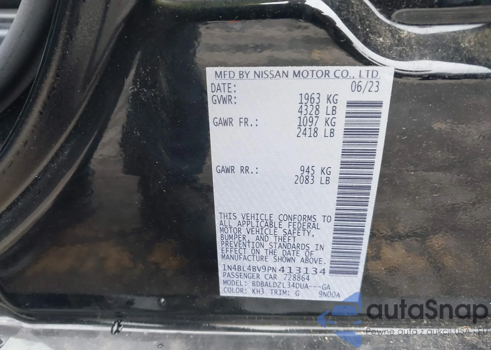 • VIN 1N4BL4BV9PN413134