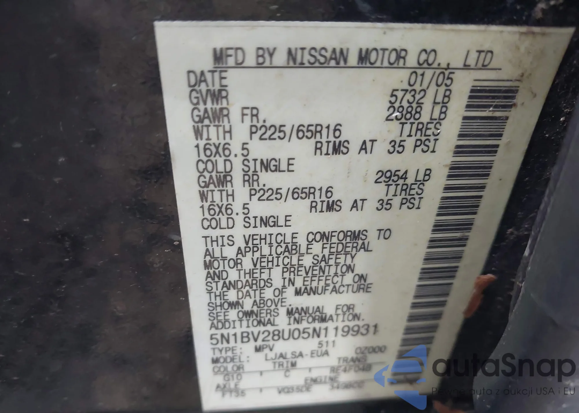 2005 Nissan Quest 3.5 z USA, uszkodzony, nr VIN 5N1BV28U05N119931