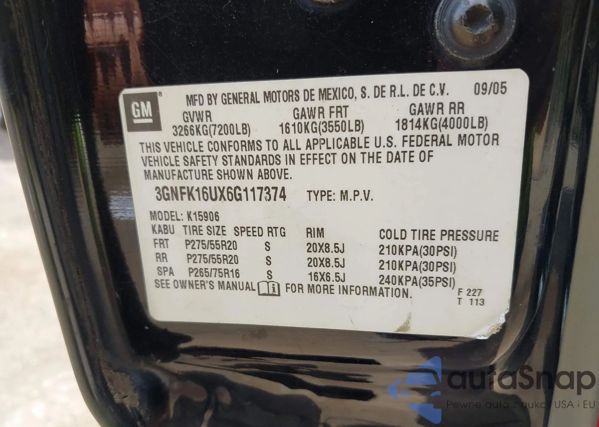 • VIN 3GNFK16UX6G117374