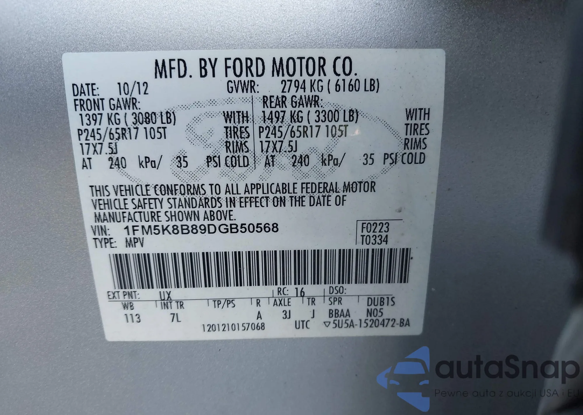 LOT: 43086830 VIN: 1FM5K8B89DGB50568