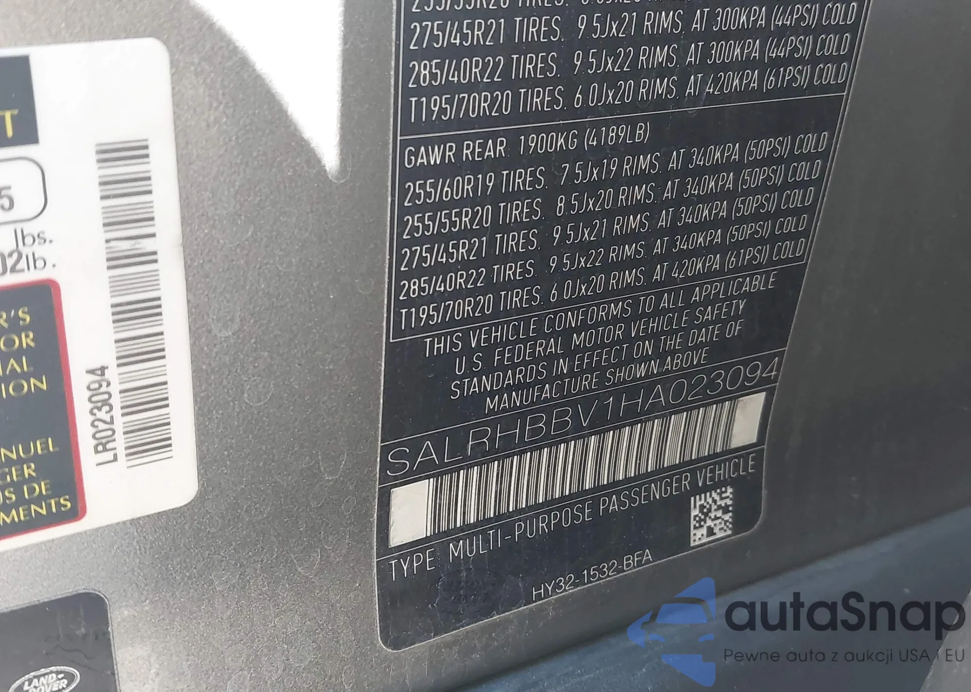 LOT: 42249130 VIN: SALRHBBV1HA023094