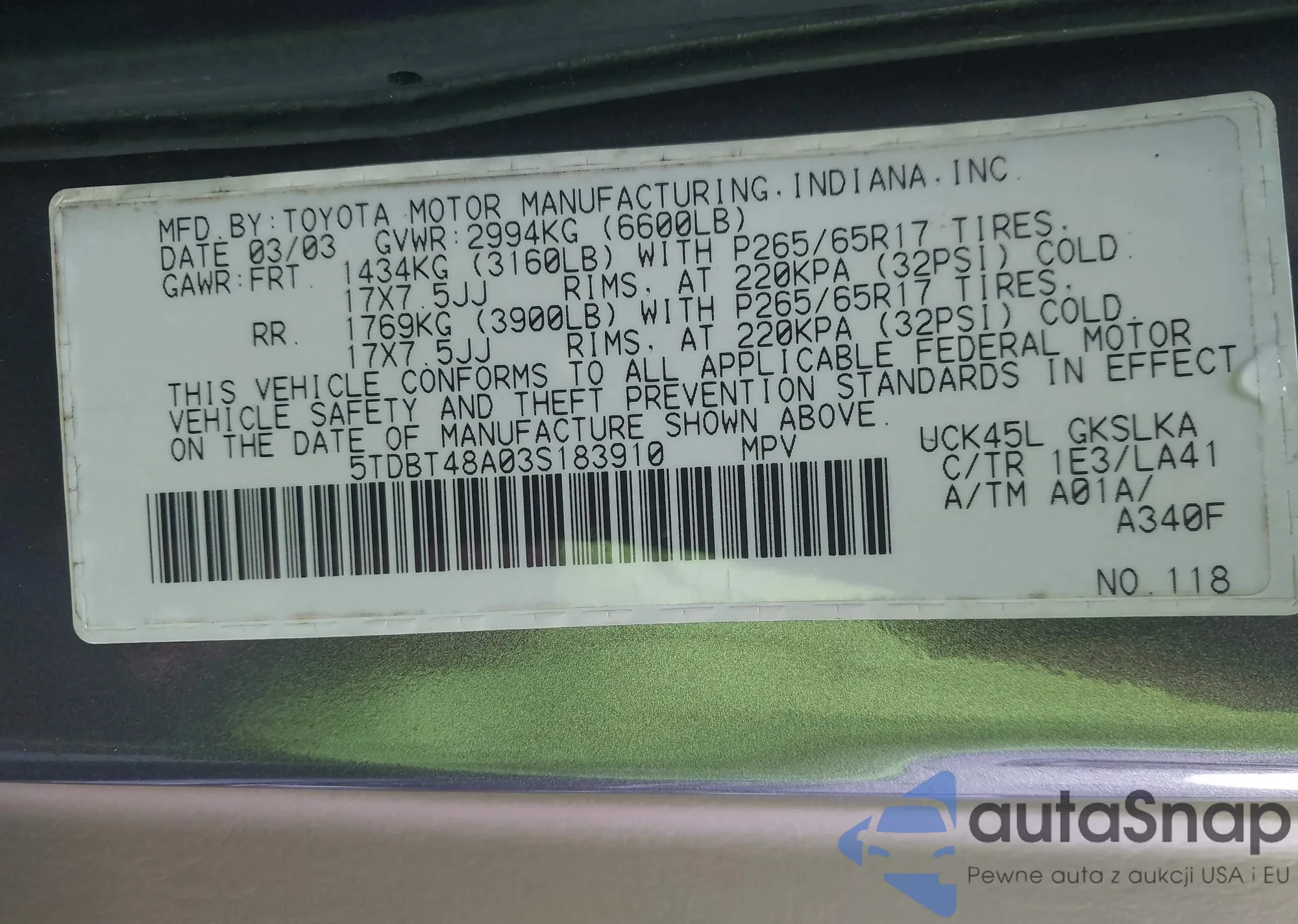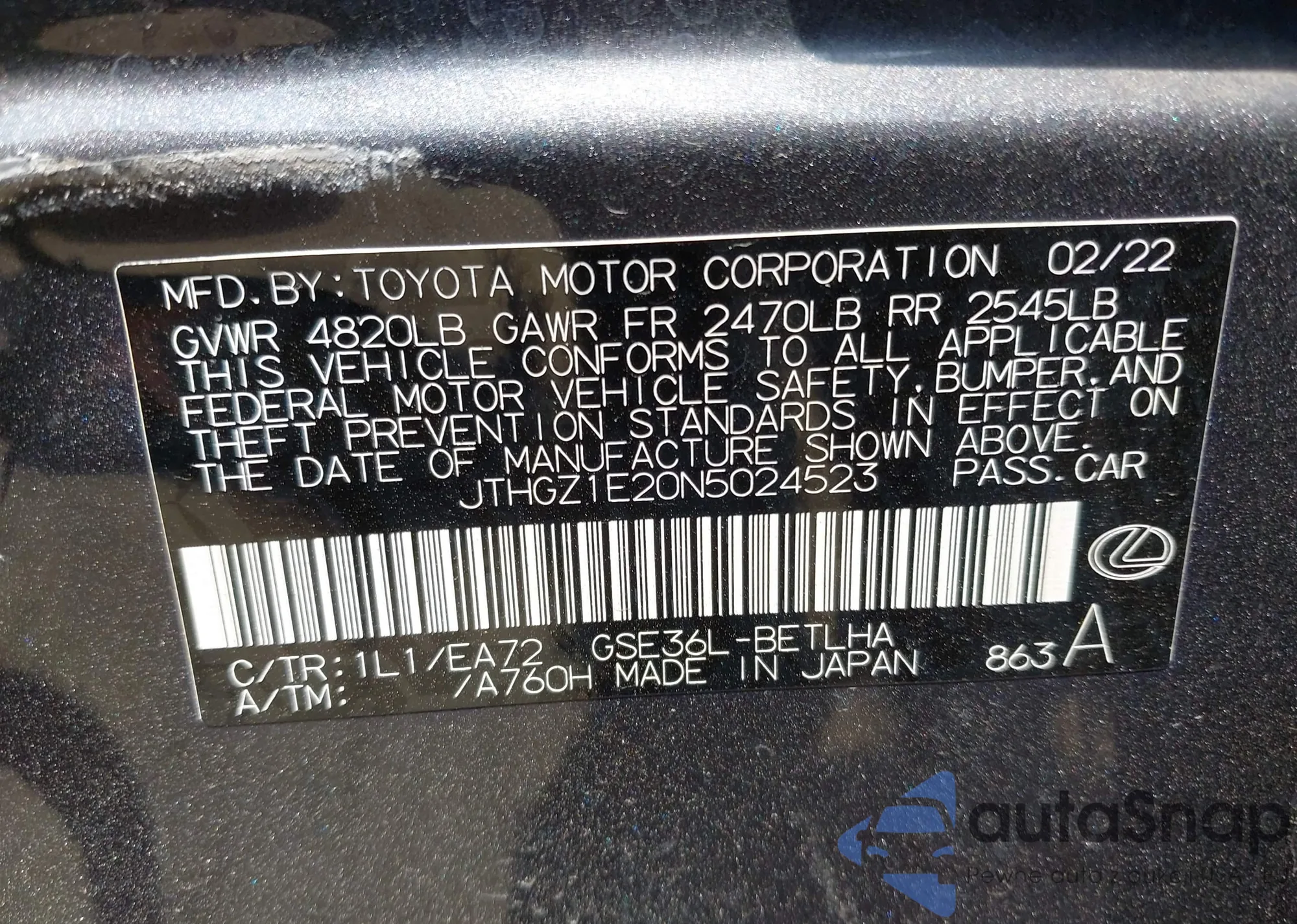 LOT: 43152166 VIN: JT8BF22G0V5002269